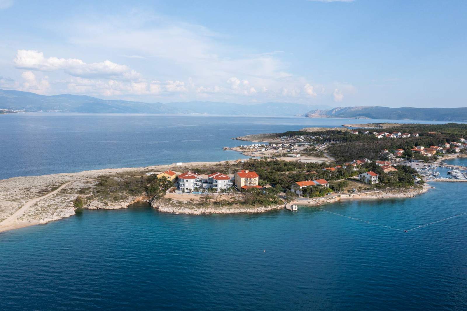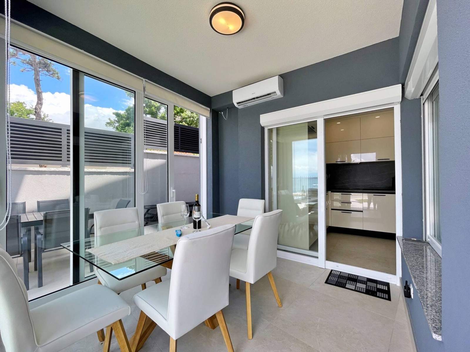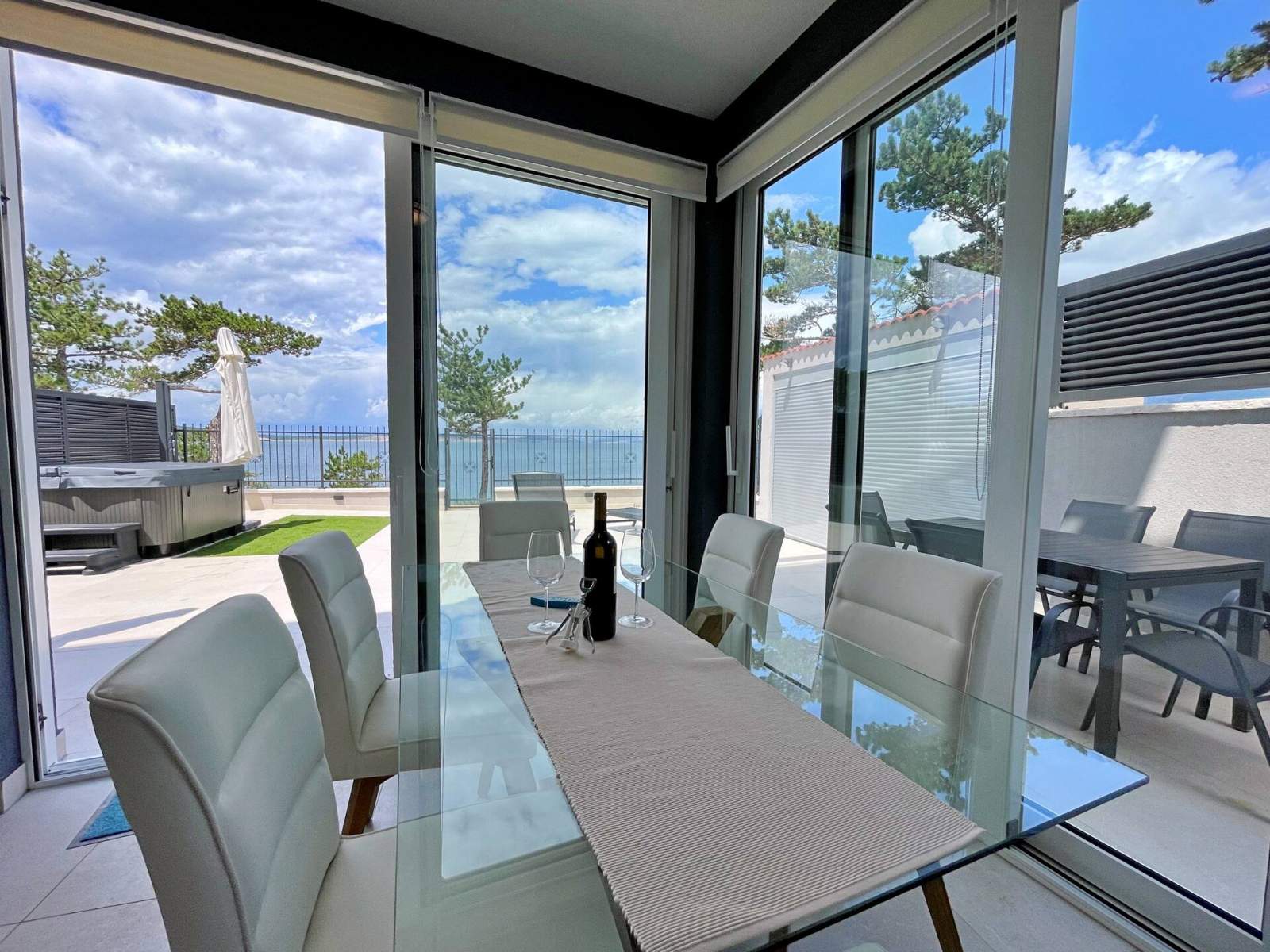 Diese Wohnung befindet sich 30 m vom Meer und verfügt über 2 Schlafzimmer für maximal 4 Personen. Es ist modern ausgestattet mit vier Klimaanlagen und drei Smart-TVs mit Satellitenprogrammen (im Wohnzimmer und in den Schlafzimmern). Die Küche verfügt über ein Induktionskochfeld mit passendem Geschirr, einen Kühlschrank mit separatem Gefrierfach, eine Kaffeemaschine, einen Toaster, einen Wasserkocher, einen Geschirrspüler und eine Mikrowelle. Die Wohnung verfügt über eine Veranda, die als Esszimmer dient (abschließbar und klimatisiert). Die Terrasse ist komplett eingezäunt und privat. Auf der Terrasse gibt es Liegestühle zum Sonnenbaden, Gartenmöbel mit Sonnenschirm, einen zusätzlichen Esstisch, einen Whirlpool, einen Kühlschrank für Getränke und eine Außendusche. Von der Terrasse aus können Sie zum Meer oder zum Pool auf der Nachbarterrasse gehen.