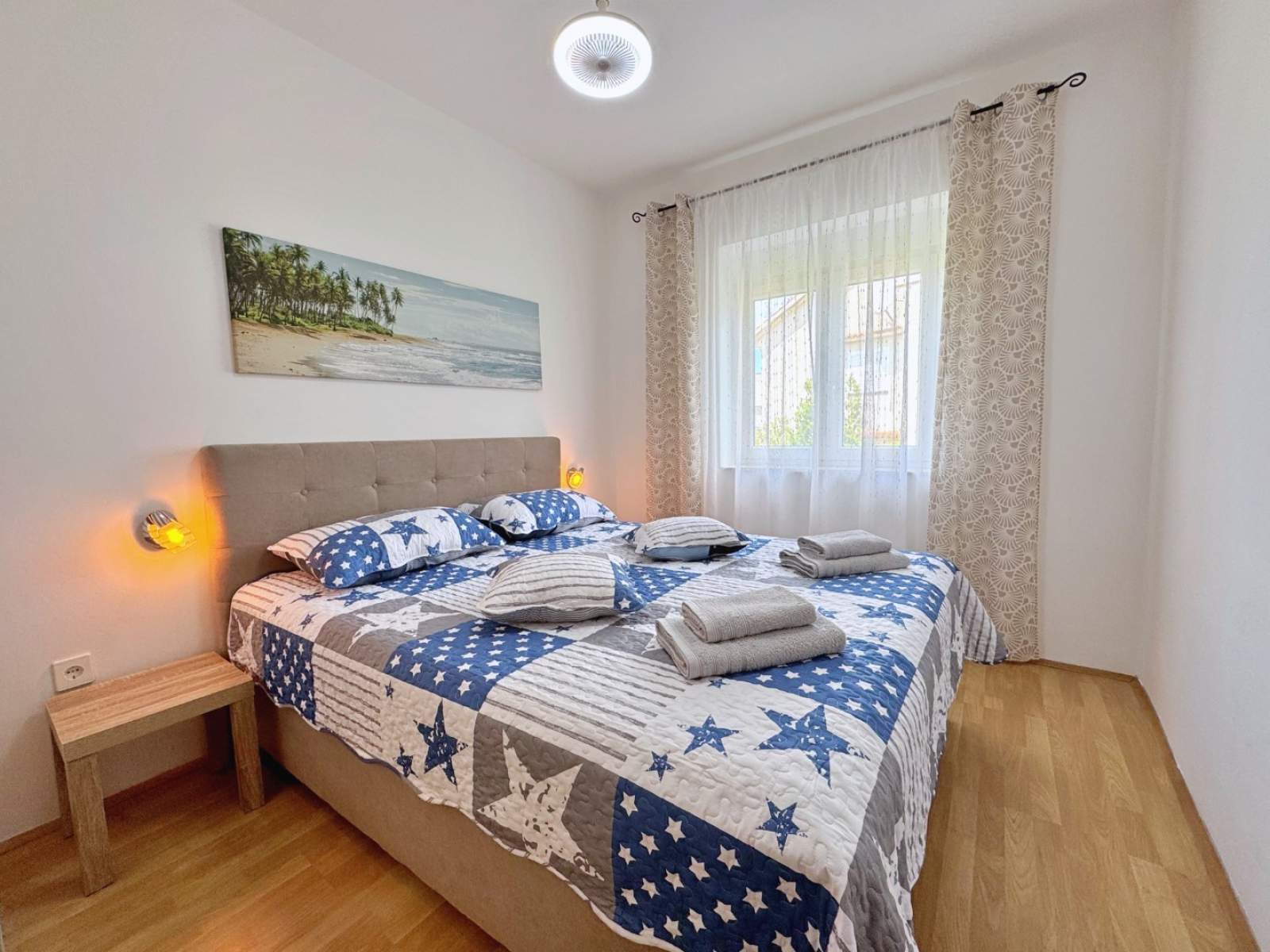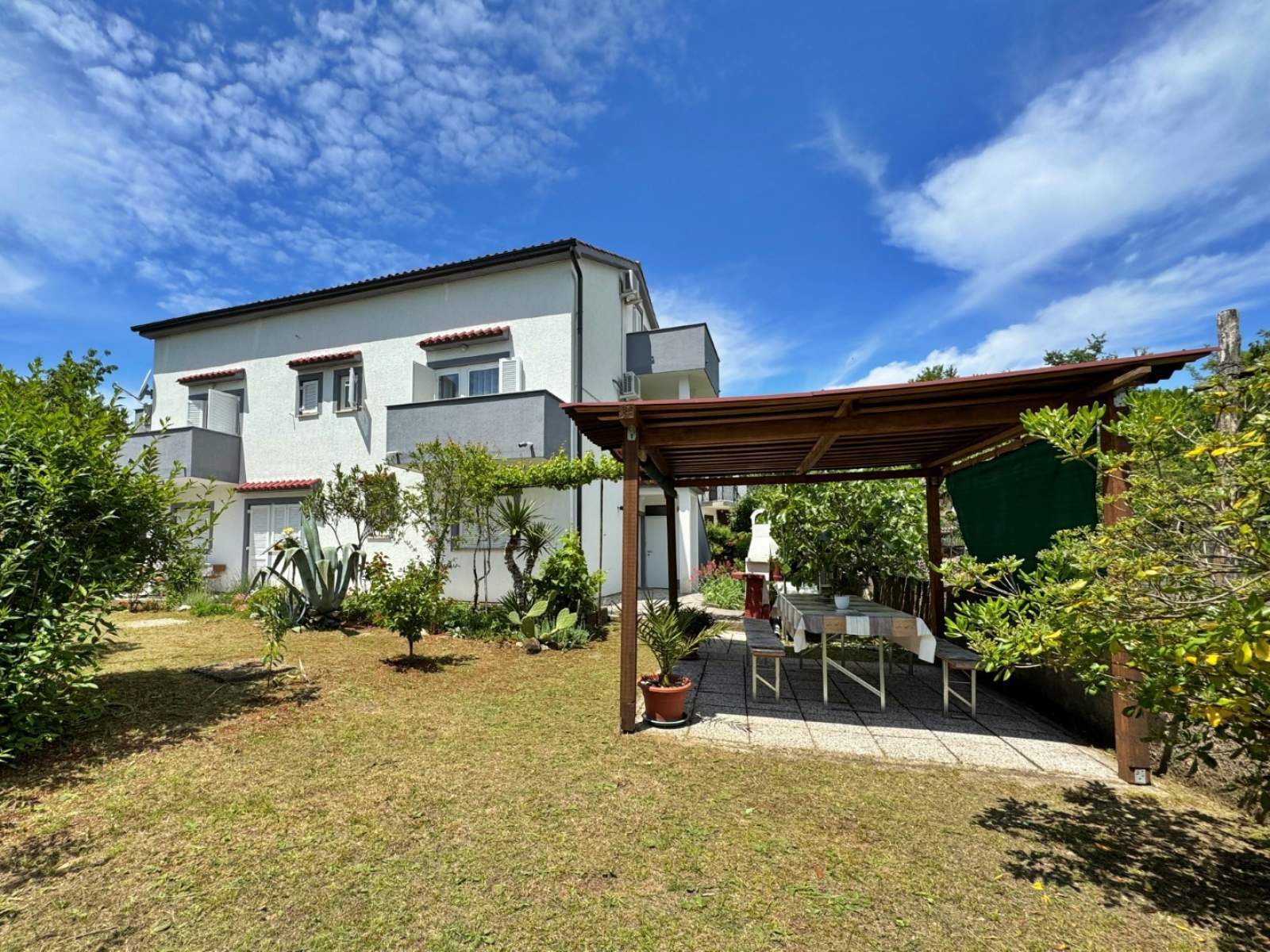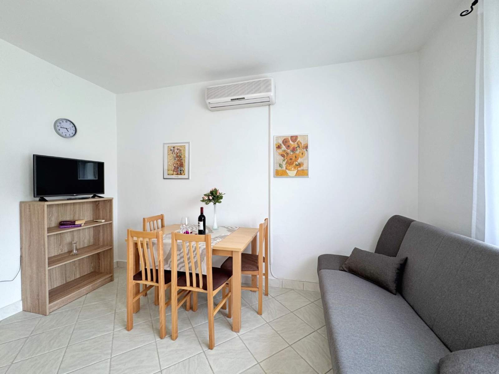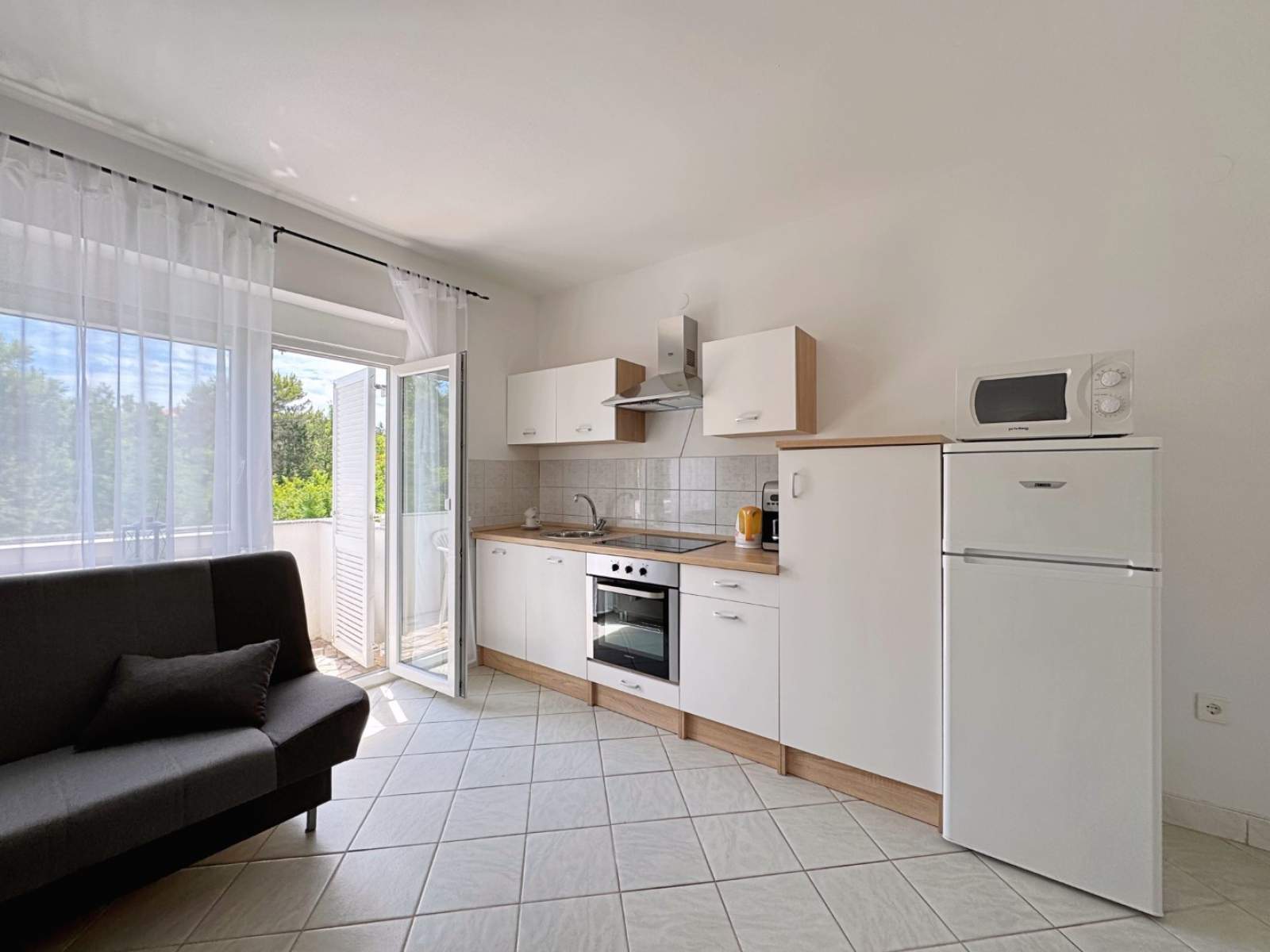 Dieses Apartment im ersten Stock liegt nur 450 m vom Meer und 40 m von einem Supermarkt in einer ruhigen Gegend entfernt und ist perfekt für einen erholsamen Aufenthalt. Es verfügt über zwei Schlafzimmer mit Doppelbetten, von denen eines Zugang zum Balkon hat. Das Wohnzimmer und die Küche befinden sich in einem offenen Raum, der mit Elektroherd, Backofen, Kühlschrank, Mikrowelle, Toaster, Wasserkocher und Kaffeemaschine ausgestattet ist. Das Badezimmer verfügt über eine Dusche, Toilette, Bidet und einen Haartrockner. Der Balkon (6 m2) mit Aussicht aufs Grüne ist auch vom Wohnzimmer aus zugänglich. Genießen Sie Annehmlichkeiten wie Klimaanlage, WLAN und kostenloser Parkplatz. Die Gäste können auch den Gemeinschaftsgarten mit Grill und Sitzbereich nutzen.