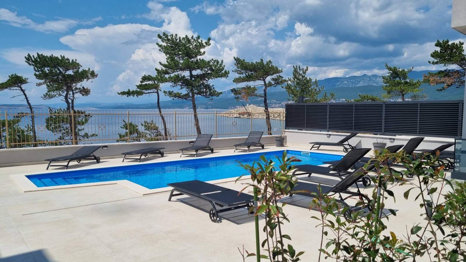 Die Terrasse (16 m2) bietet direkten Zugang zum Poolbereich und eine wunderschöne Aussicht auf den Pool und das Meer. Der Poolbereich ist mit Sonnenliegen, Sonnenschirmen und einer Außendusche ausgestattet und bietet direkten Zugang zum Meer zum bequemen Schwimmen. Ein gemeinsamer Waschraum im Erdgeschoss umfasst eine Waschmaschine, Waschkapseln/Waschmittel und ein Bügeleisen zur Nutzung durch die Gäste.