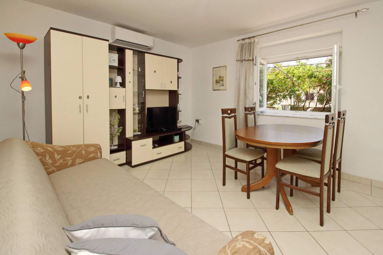 Dieses charmante Erdgeschossapartment in Šilo auf der Insel Krk bietet einen perfekten Rückzugsort für 2-4 Gäste. Betreten Sie ein gemütliches Interieur mit einem Schlafzimmer mit einem Doppelbett, einem Kleiderschrank und einem bequemen Ausziehsofa für eine Person. Der einladende Wohn-/Essbereich umfasst auch ein Schlafsofa für zwei Personen, einen Esstisch, eine Klimaanlage und Satellitenfernsehen und ist der perfekte Ort zum Entspannen. Die Küche verfügt über einen 4-Flammen-Elektroherd, einen Kühlschrank mit Gefrierfach, einen Wasserkocher und eine Kaffeemaschine. Im Badezimmer finden Sie eine Dusche, ein Bidet, eine Toilette und einen Haartrockner. Handtücher werden ebenfalls bereitgestellt.