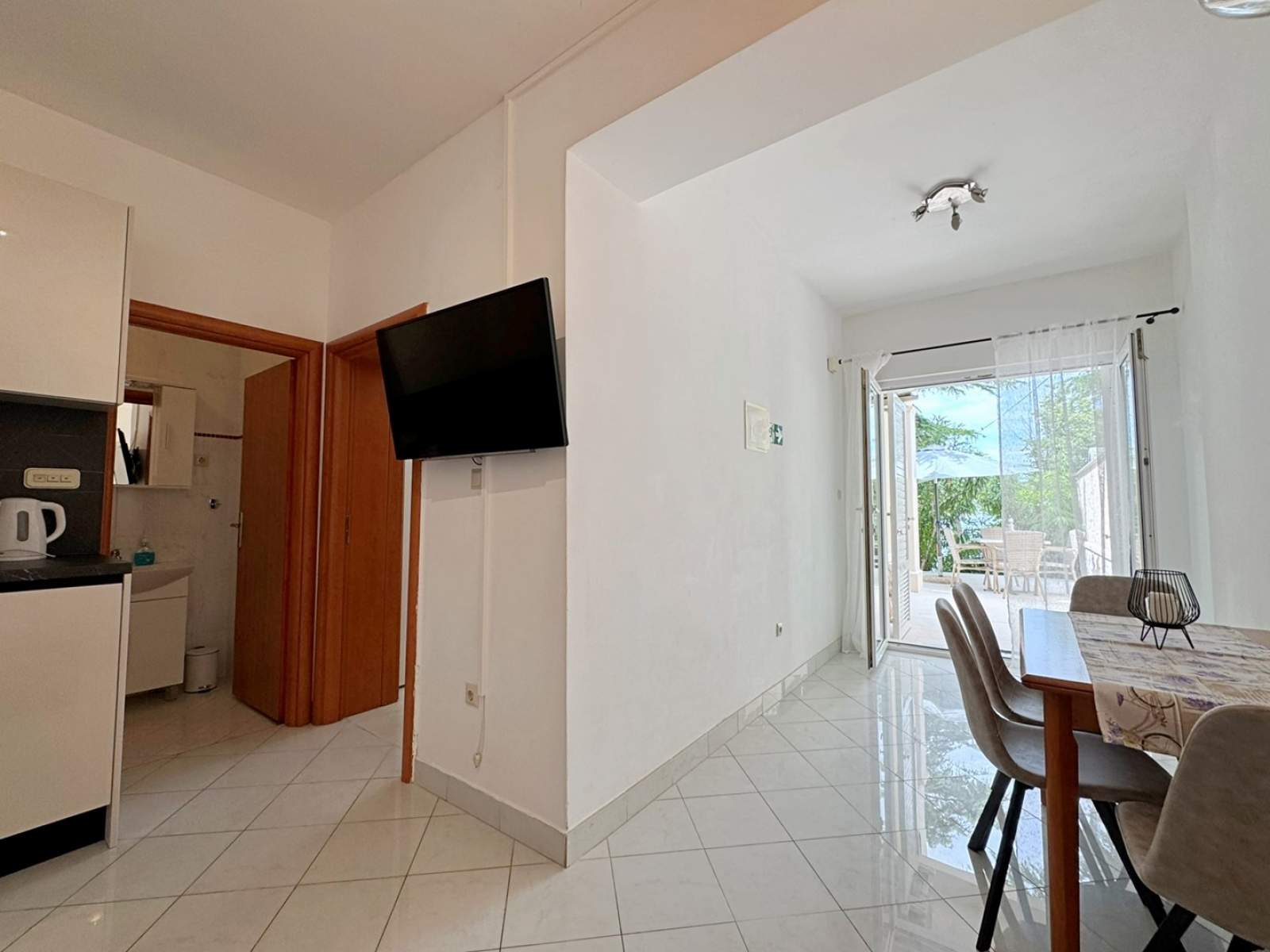 Dieses Apartment liegt nur 20 m vom Meer und einem Sandstrand entfernt und bietet den perfekten Rückzugsort am Meer. Es verfügt über ein Schlafzimmer mit Doppelbett und Klimaanlage, ein Wohnzimmer mit ausziehbarem Sofa für zwei Personen, einen Esstisch und WLAN. Die Küche ist mit einem Herd, einem Kühlschrank mit Gefrierfach, einer Mikrowelle, einer Spülmaschine, einer Kaffeemaschine und einem Wasserkocher ausgestattet. Eine 20 m2 große Terrasse, die sowohl vom Wohnzimmer als auch vom Schlafzimmer aus zugänglich ist, bietet einen atemberaubenden Blick auf das Meer und den Garten und wird mit einem anderen Apartment geteilt. Das Badezimmer verfügt über eine Dusche, eine Toilette und einen Haartrockner. Den Gästen stehen eine Außendusche, ein gemeinsamer Grillbereich und ein privater Parkplatz hinter dem Haus zur Verfügung.