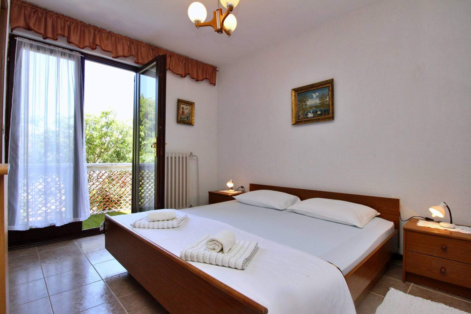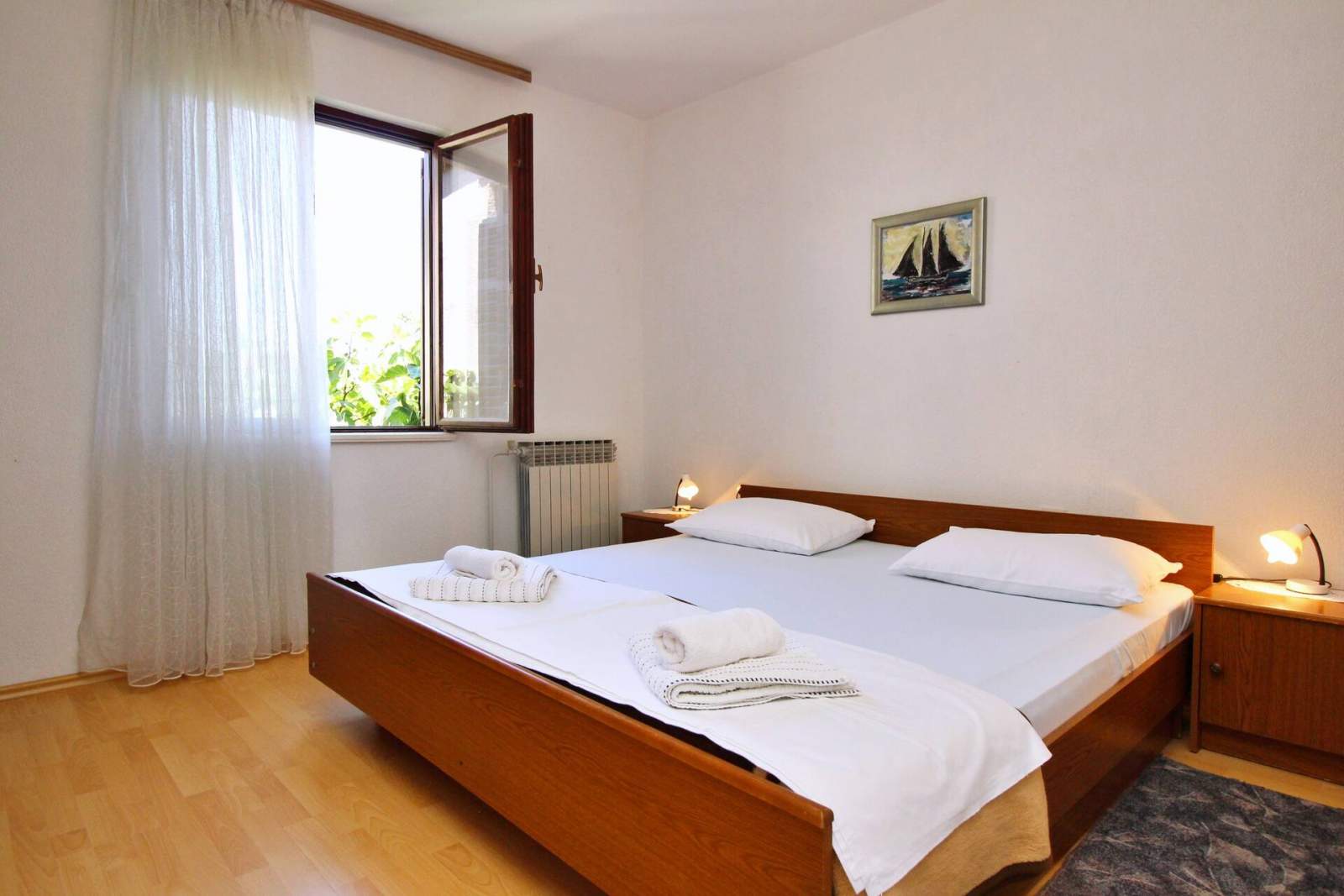 Enjoy your summer holiday in this cozy apartment in the charming fishing village of Šilo on the island of Krk. Known for sandy and pebble beaches, natural coves, and scenic hiking trails, Šilo offers a perfect getaway. This first-floor apartment accommodates 4-5 people with two bedrooms (each with a double bed) and a sofa bed in the living room. The well-equipped kitchen includes a 4-burner stove (electric/gas), oven, fridge-freezer, coffee machine, microwave, toaster, and dishwasher. The living room has a TV with satellite and cable channels.