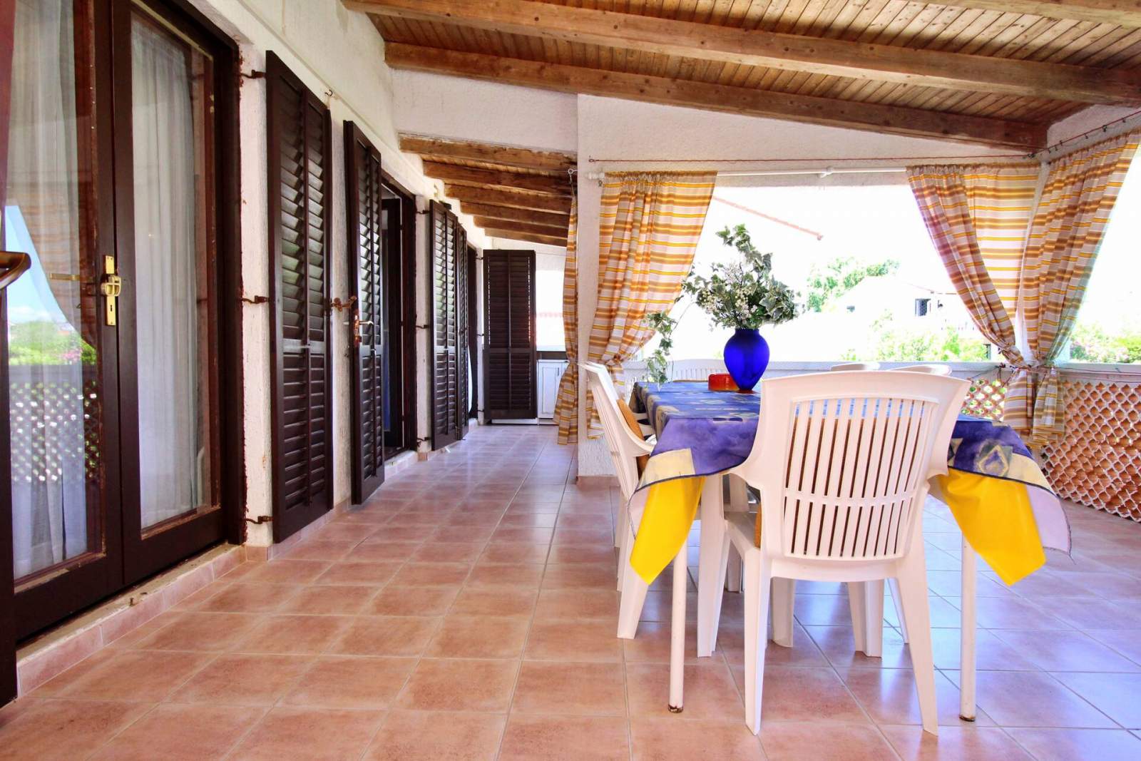 The apartment is in a great location; the beaches are easily accessible on foot. A small supermarket with a good selection is also within walking distance. The large terrace offers a lovely view. The apartment was well-equipped, even including a washing machine. The owners were very nice and friendly. We had a wonderful and relaxing holiday.