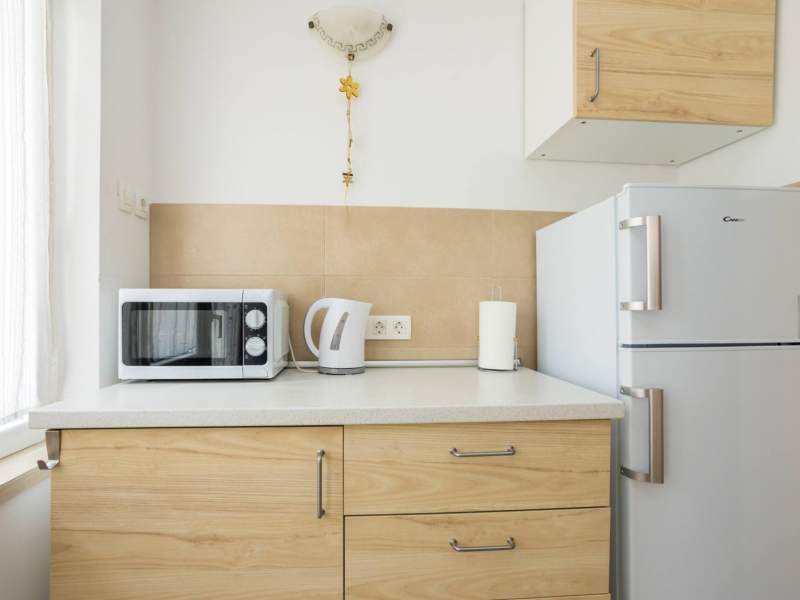 The fully equipped kitchen includes modern appliances, such as a 4-burner electric stove, refrigerator with freezer, microwave, oven, dishwasher, kettle, coffee machine, and toaster. Additional amenities include a vacuum cleaner, iron, and a baby cot available upon request.