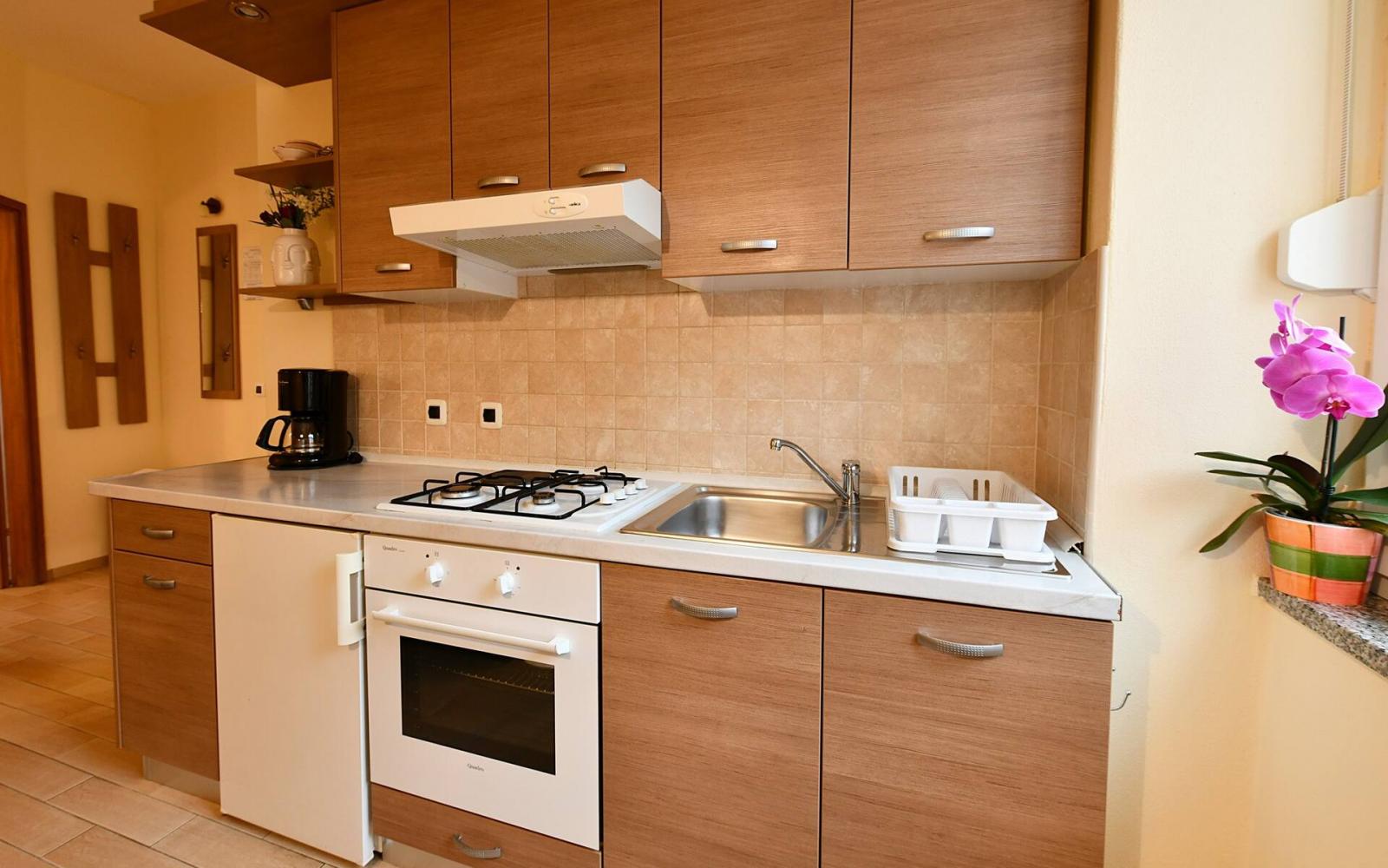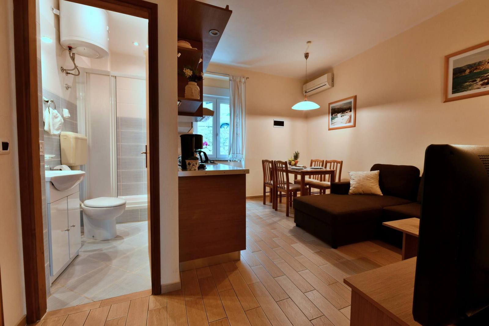 The apartment features a fully equipped kitchen with living room and dining area (an additional bed on the couch) and a bathroom (shower, toilet).