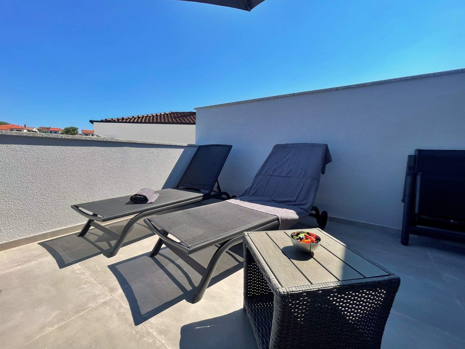 The apartment includes one bathroom with a shower, toilet, two sinks, and washer/dryer, and a separate bathroom with a toilet and sink. The apartment also has a vacuum cleaner and an iron. Relax on the 12 m2 balcony overlooking a quiet street, on the 12 m2 terrace with sea view complete with sun loungers and a parasol. Next to the terrace, you will also find a loggia (8 m2) that serves as a dining area and offers stunning views of the neighborhood's greenery. Air conditioning units are available in both bedrooms and the kitchen/living room area, ensuring comfort throughout the apartment. The main entrance is located on the ground floor, and the apartment on the 1st floor.