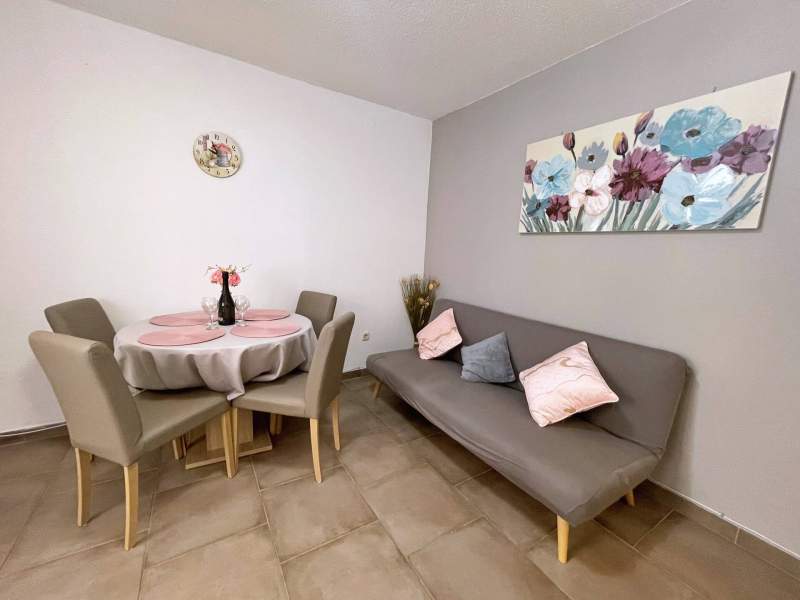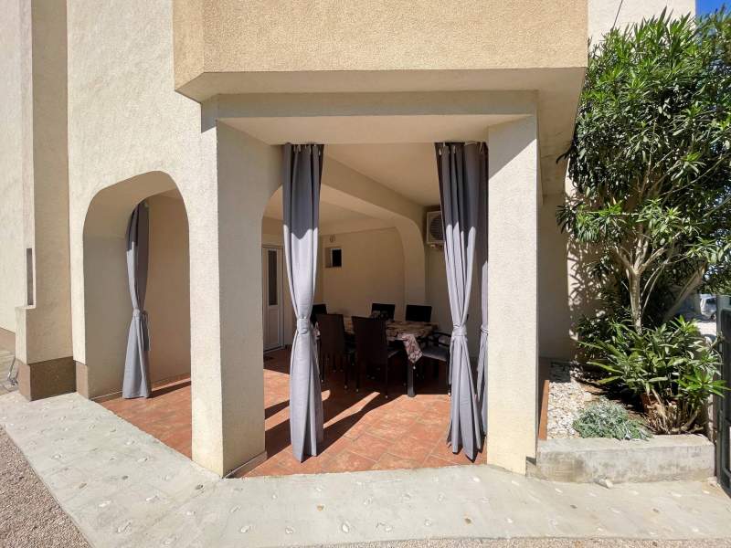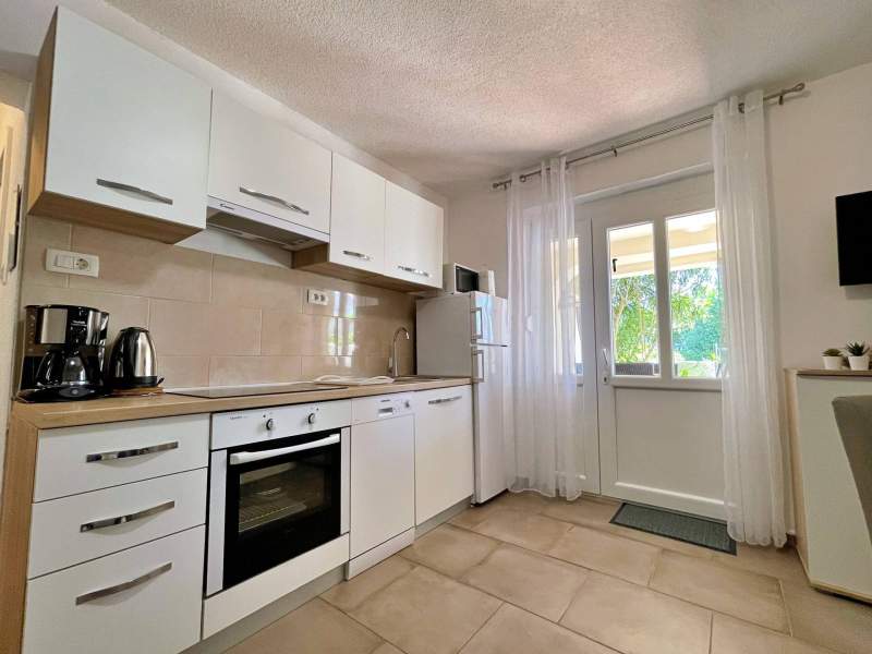 This charming ground-floor apartment is located just 20 meters from the sea, ideal for families and accommodating 4-5 guests. It features a roofed terrace at the entrance and a more private terrace with a BBQ area behind the house. The apartment includes two bedrooms with queen-size beds, and a pull-out couch in one of the rooms. A sandy beach is a comfortable 2-minute walk away, only 140 meters from the apartment.