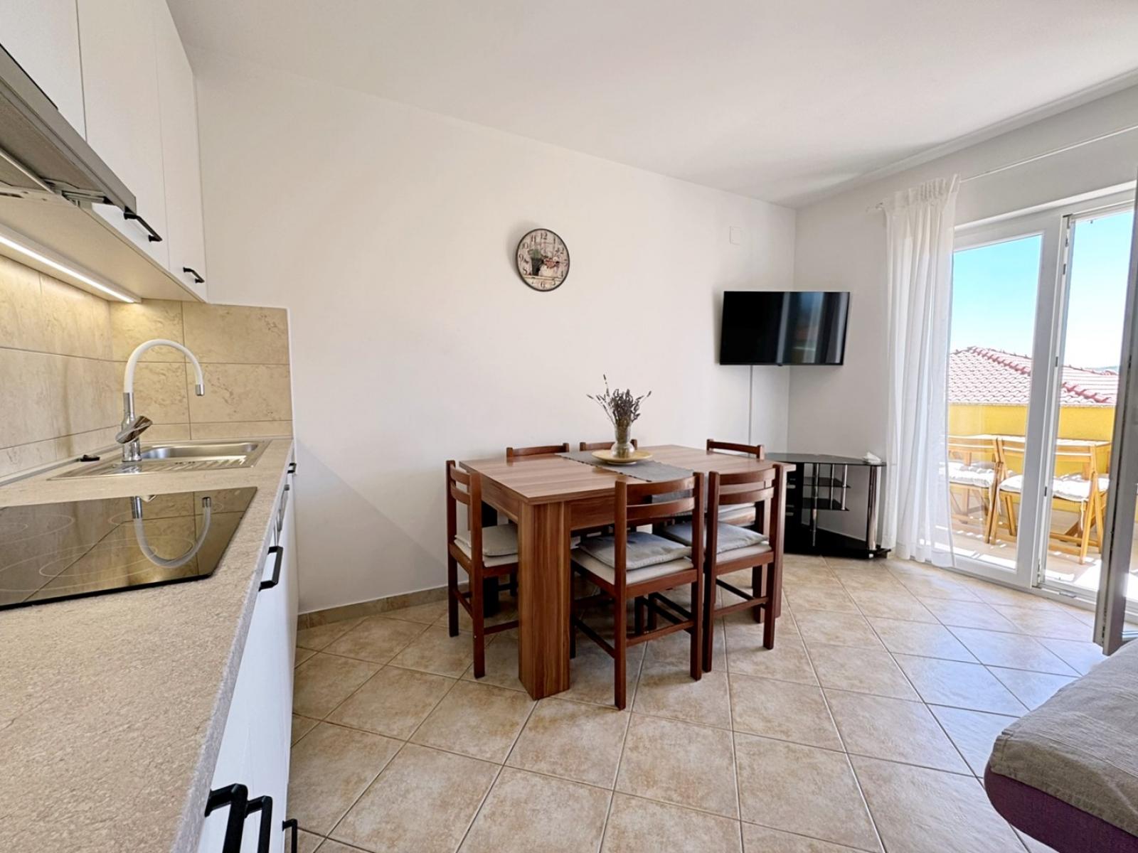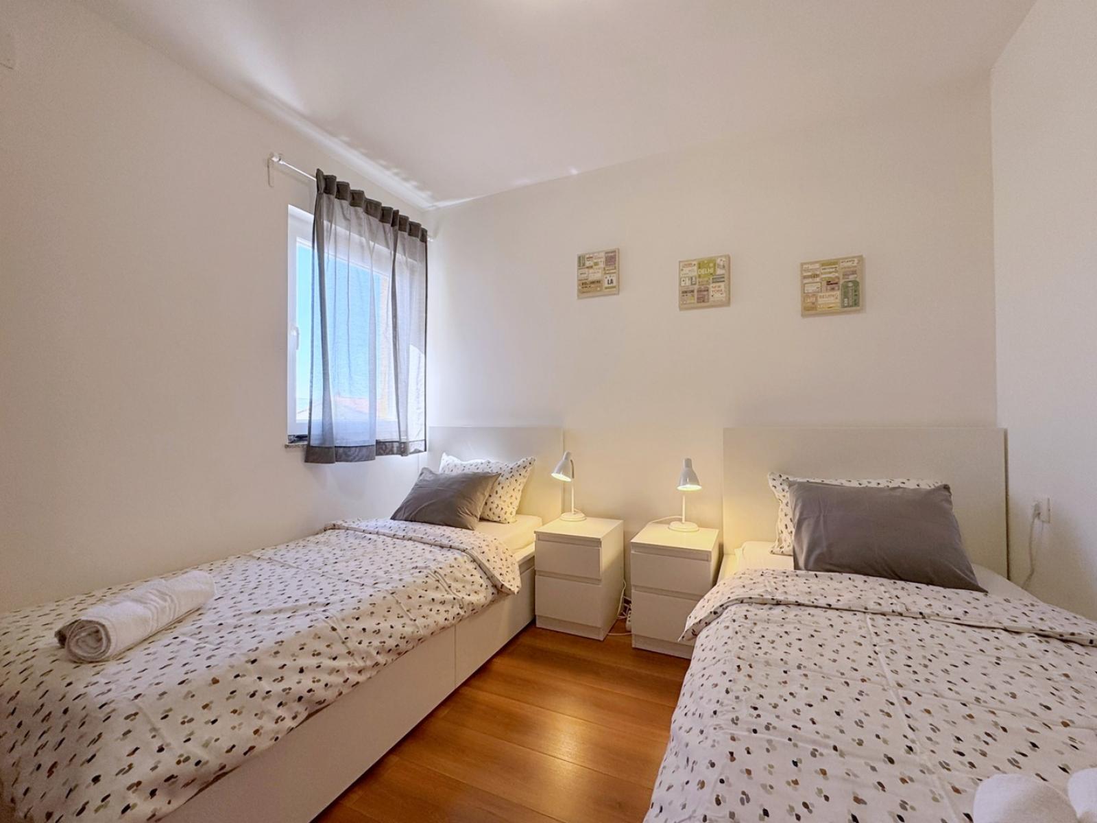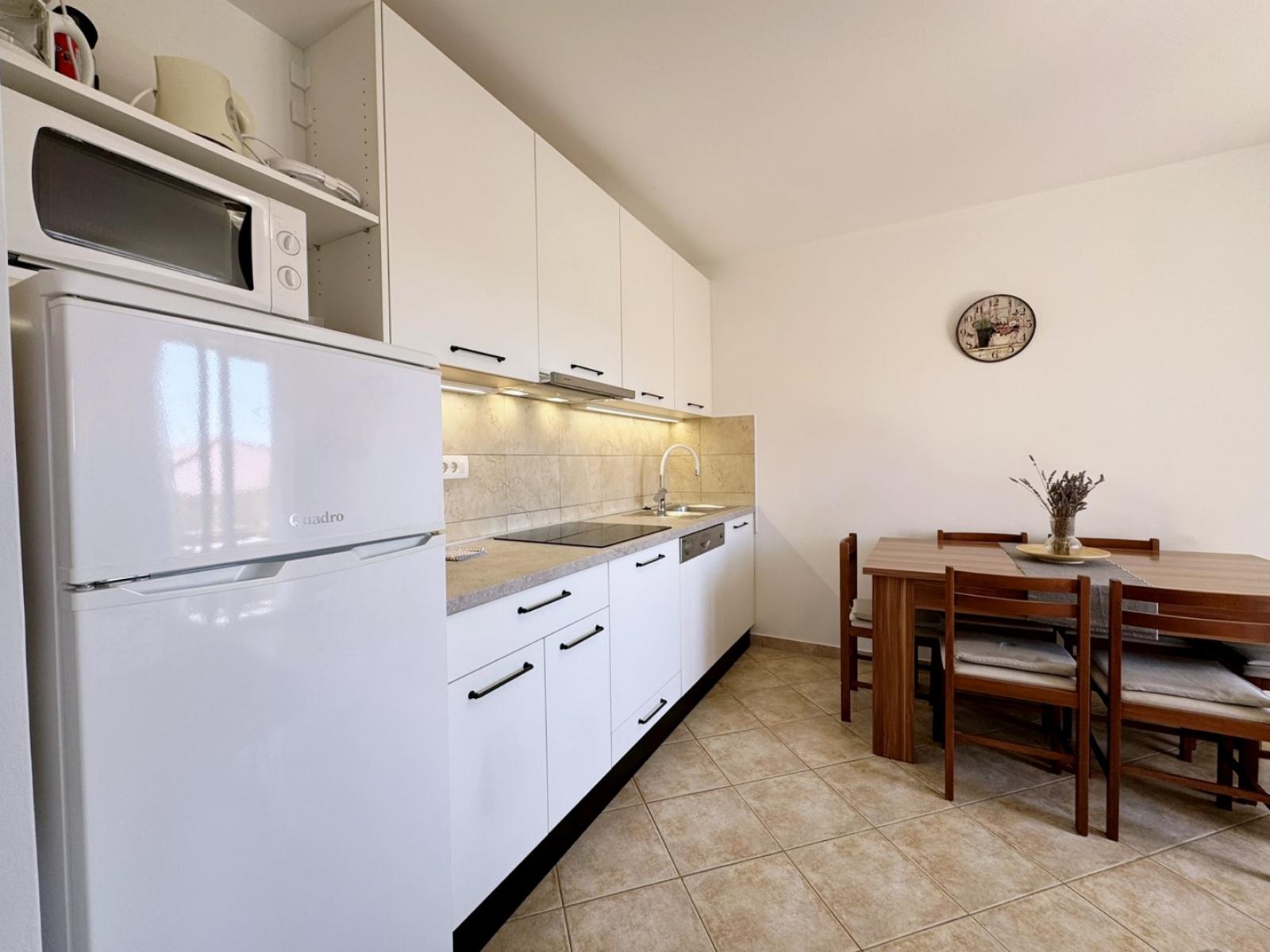 This first-floor apartment features a 7 m2 balcony with sea view. The air-conditioned kitchen and living area include a ceramic stove, fridge with freezer compartment, Nespresso coffee machine, kettle, microwave, toaster, dishwasher, dining table, pull-out couch for two, cable/satellite TV, and Wi-Fi, with direct access to the balcony. It has two bedrooms: one with a queen bed and another with two single beds. The bathroom offers a shower, toilet, and hairdryer. Guests can enjoy a shared BBQ and terrace in the yard, with free private parking in front of the building. Pets are welcome for an additional fee, and a baby cot is available upon request.