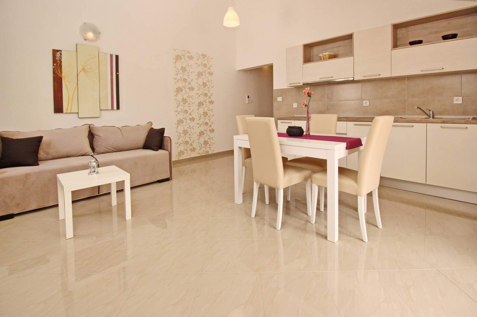 The apartment consists of one bedroom, a bathroom (shower, toilet, hair dryer, washing machine), and a bright living room with additional bed on the couch for 2 persons, air conditioning, SAT TV, free Wi-Fi and a fully equipped kitchen. The kitchen includes an electric stove, fridge with a freezer, dishwasher, microwave, coffee maker and kettle. Kitchen utensils are included.