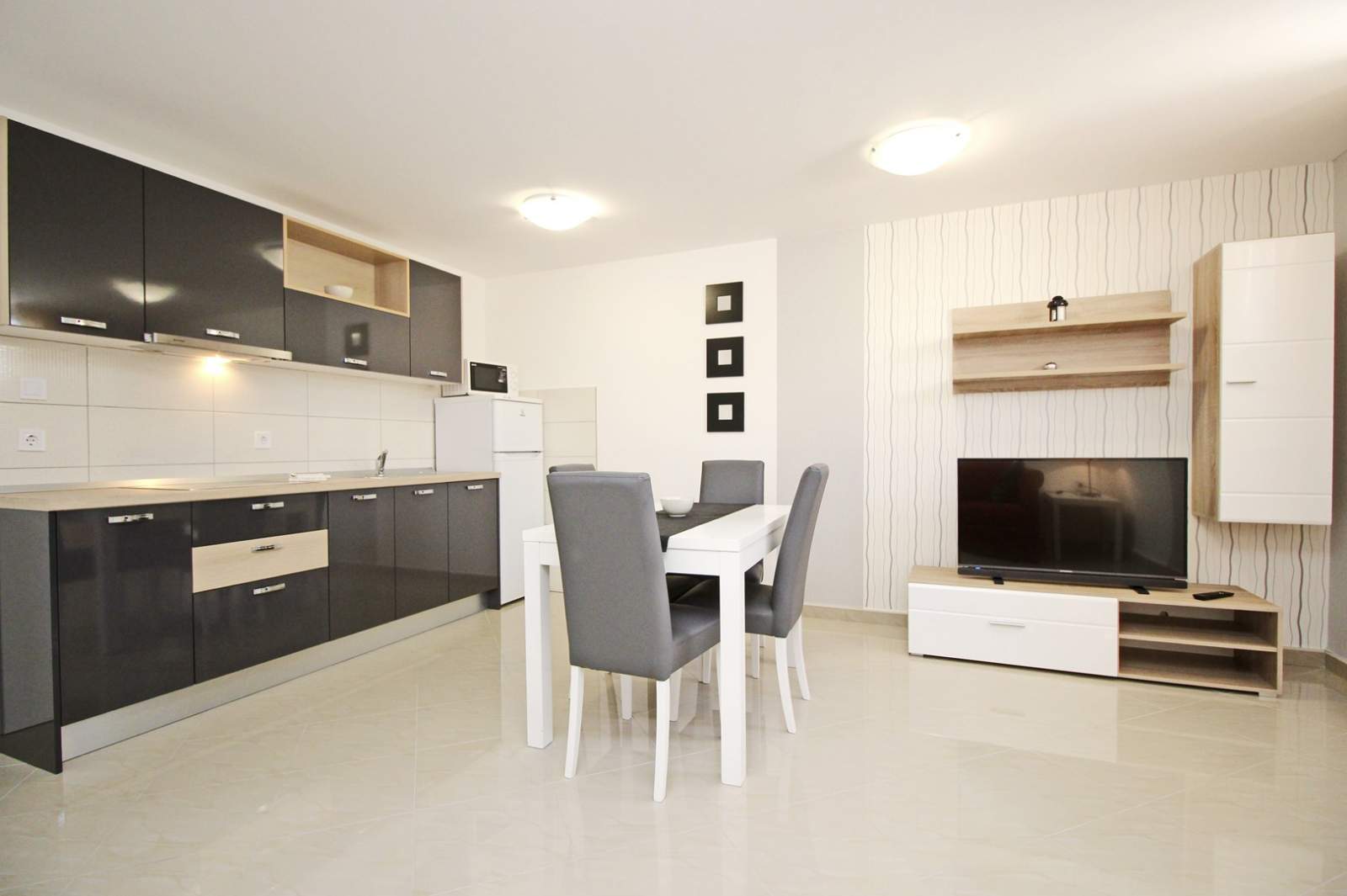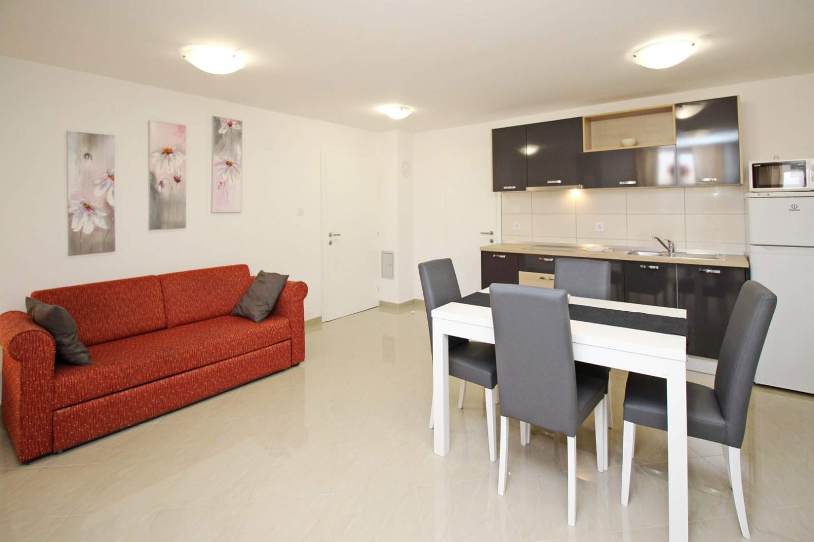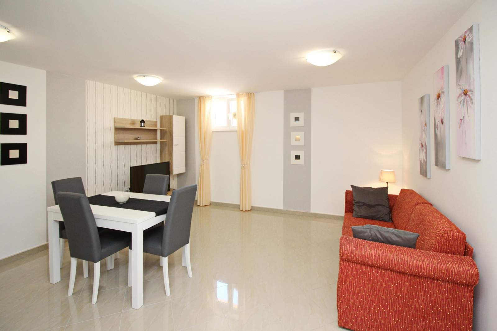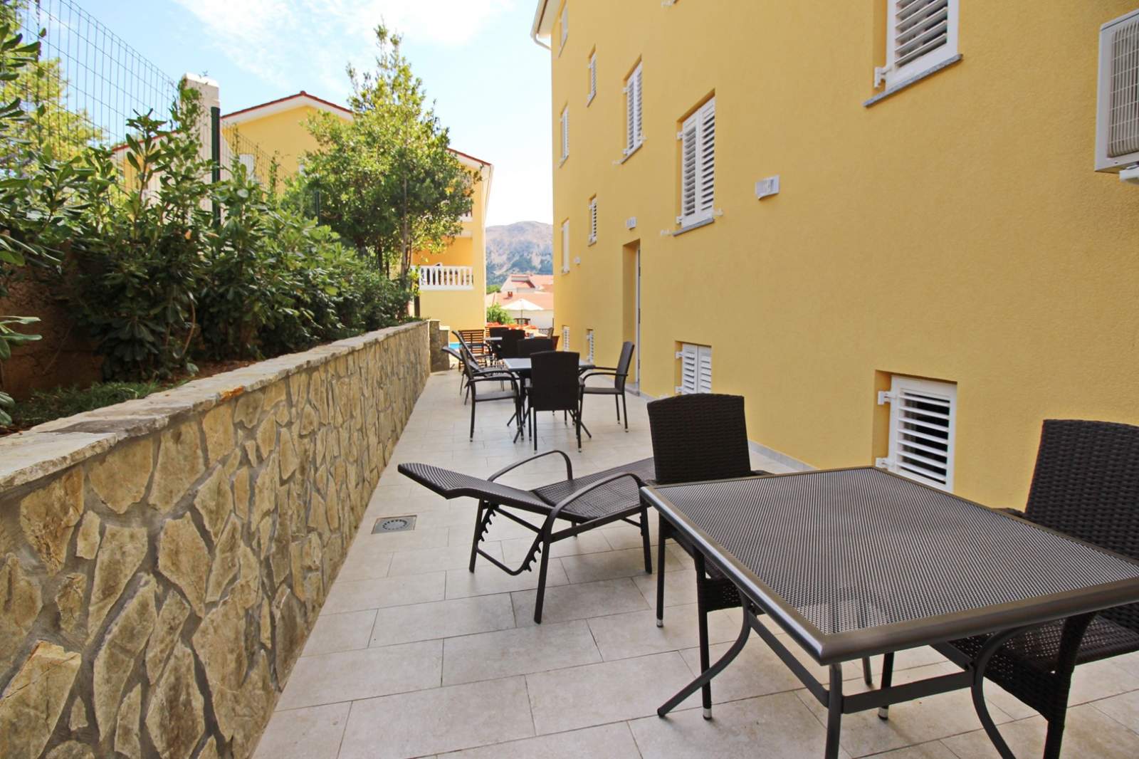 This modern, spacious apartment is located on the underground level (subterrain) of a house with shared pool, about 300 m from the main beach of Baska and 200 m from the city center.