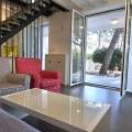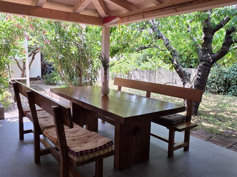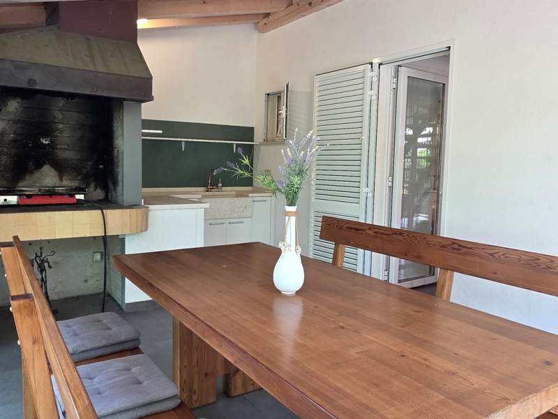 It features two furnished terraces. The larger one (25 m2) includes a dining table, a summer kitchen, and a gas BBQ.