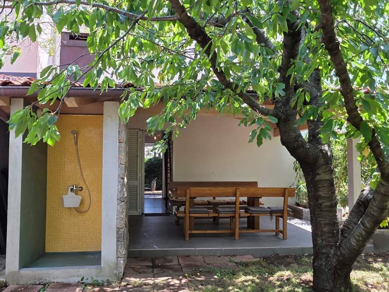 An outdoor shower is also available.