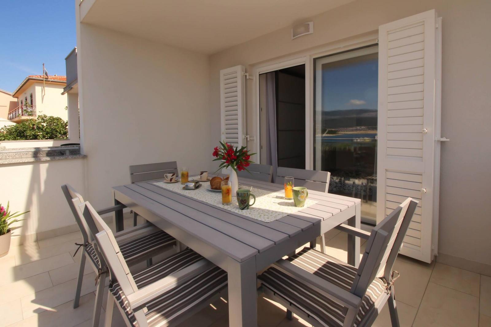 We were able to check into the apartment earlier, everything was very clean, the view was beautiful, there was also a washing machine, sun loungers outside, 2 bathrooms, 2 bedrooms, plenty of space inside and outside, the hostess was very helpful, and the sea and a bakery were right on the doorstep. Everything perfect!!!