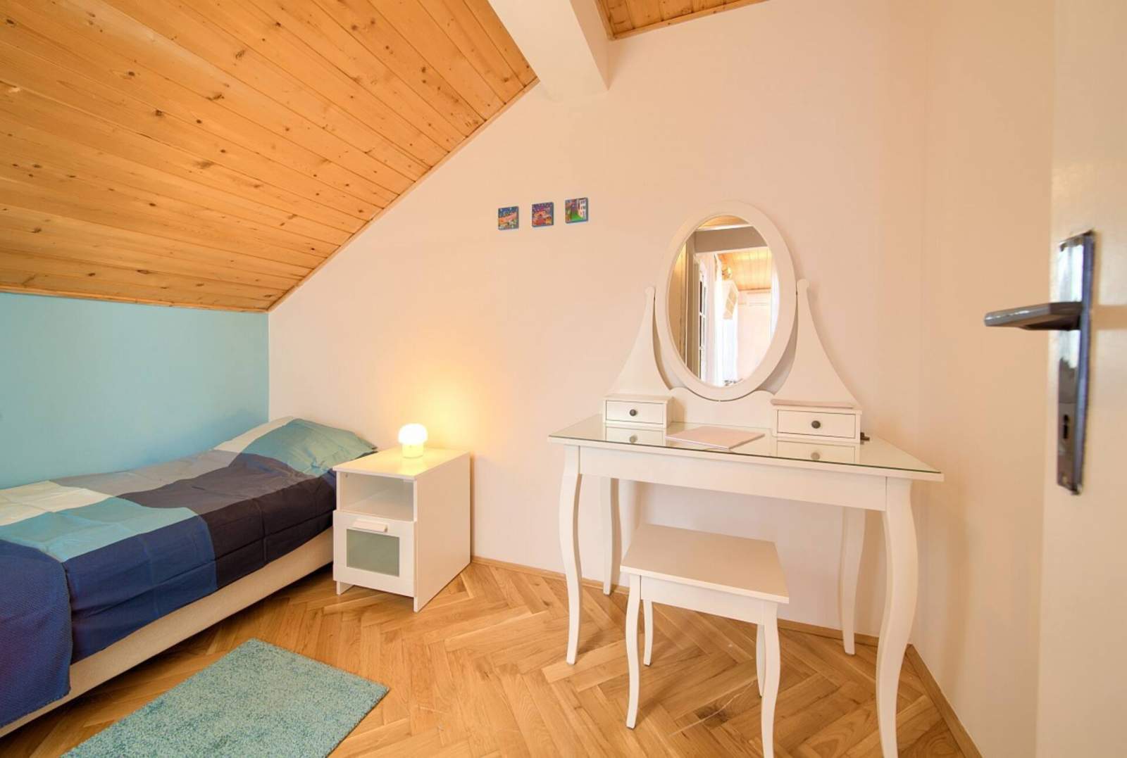 It includes 3 bedrooms (one with a double bed and other two with one single bed each).