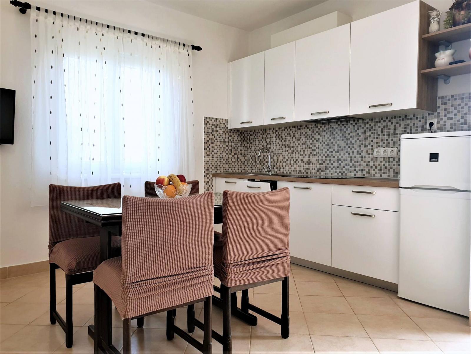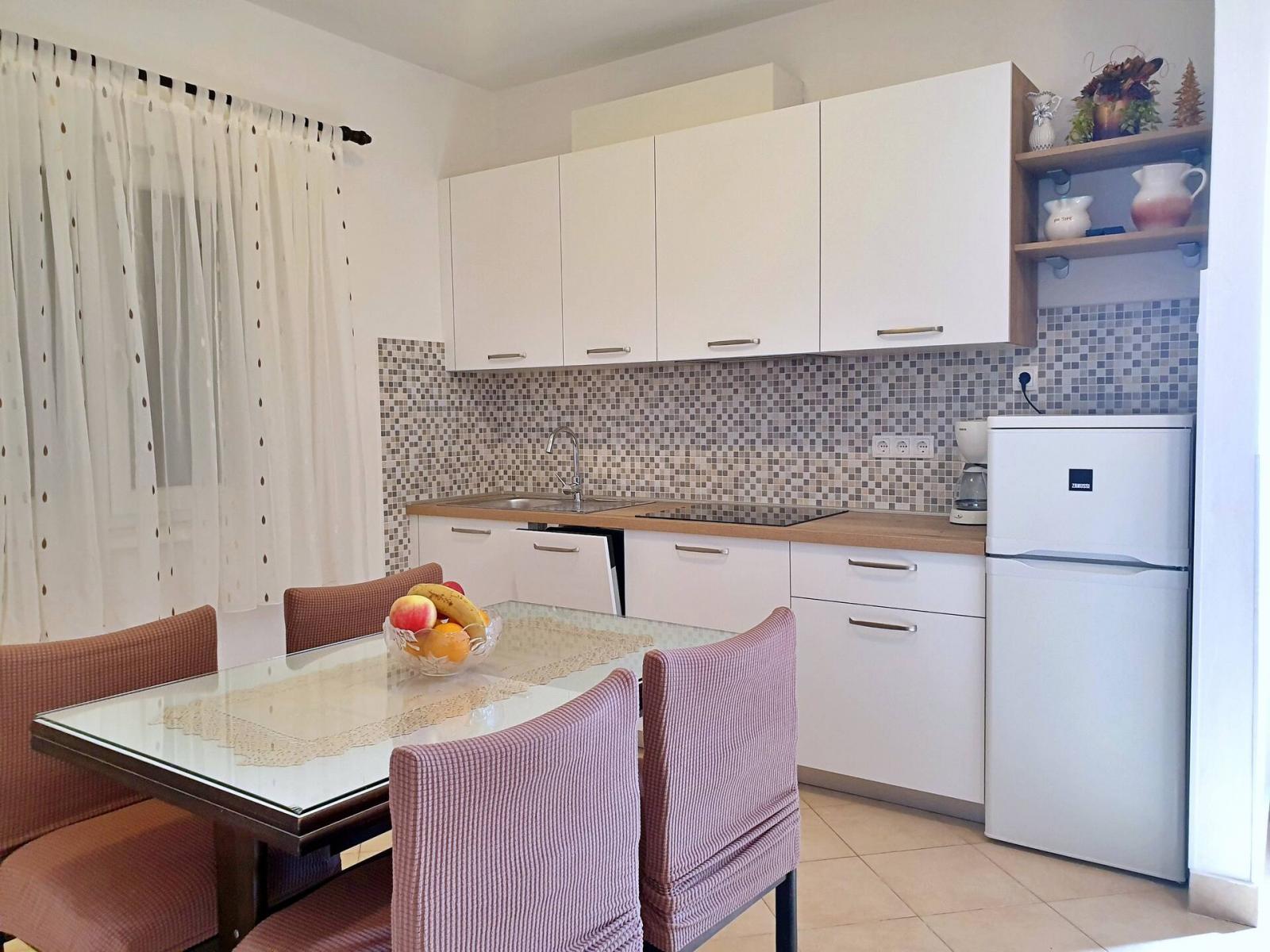 To the front, a beautiful terrace with a view of the greenery; to the rear, a small balcony with a view of the Adriatic Sea. Beautiful, spacious kitchen, all necessary electrical appliances are available, even a small dishwasher! Overall, very spacious. Short walk to the beach, shaded parking for the car, bakery around the corner. Everything was great, except the small sofa in the kitchen was really hard and uncomfortable to sit on while watching TV. We could have used a bit more storage space in the kitchen and bathroom, but we made do with two patio chairs, so it was okay.
