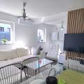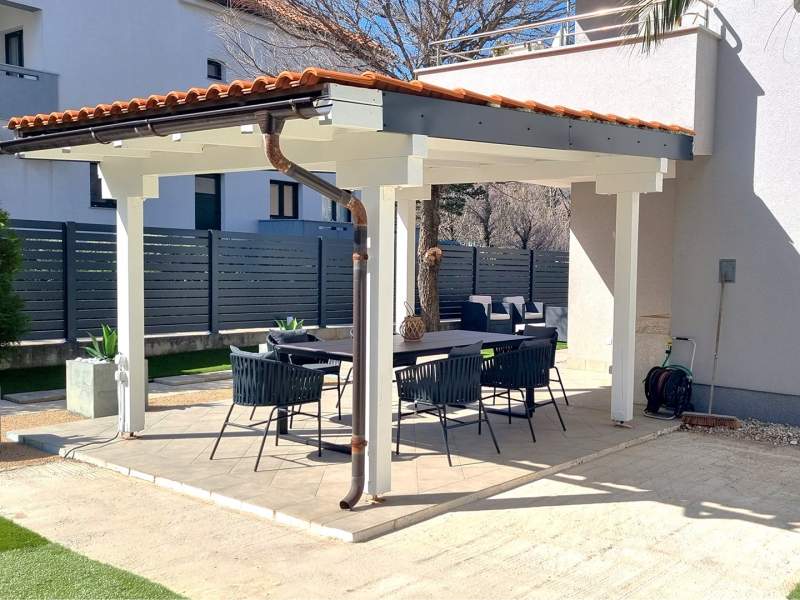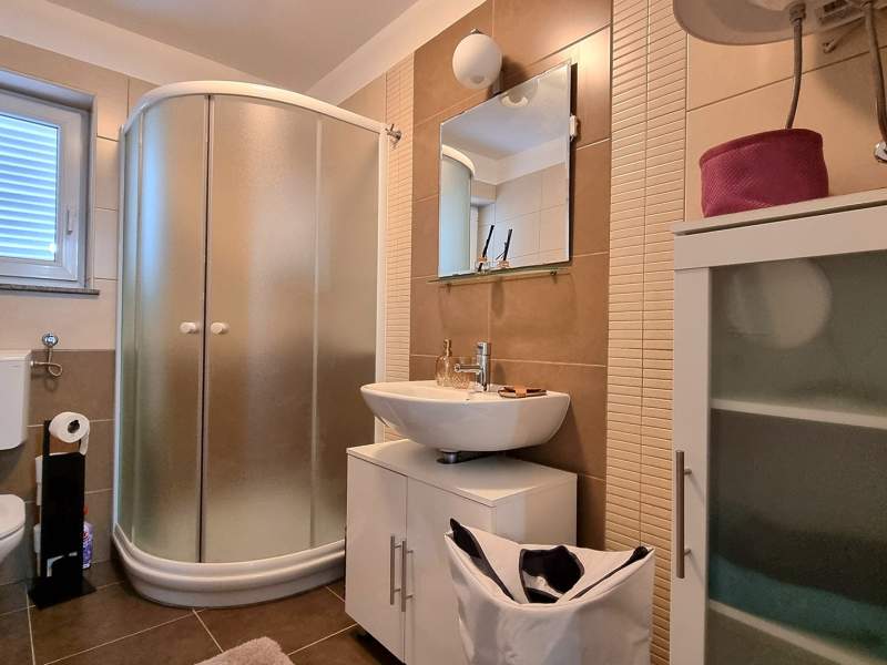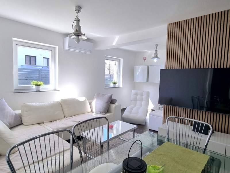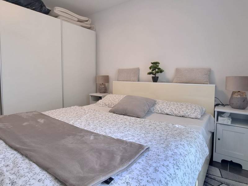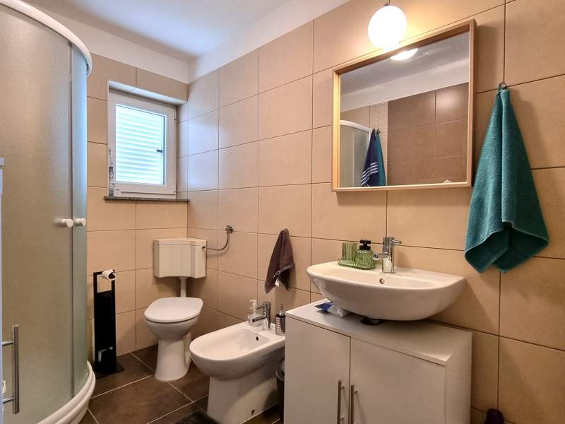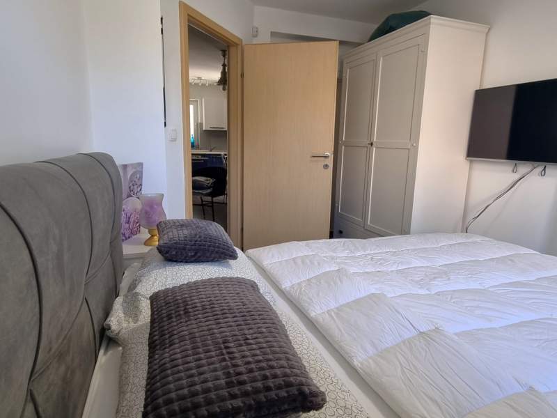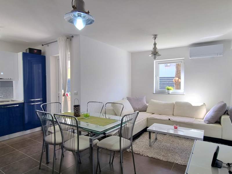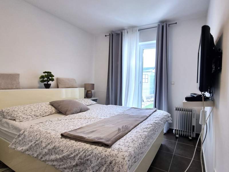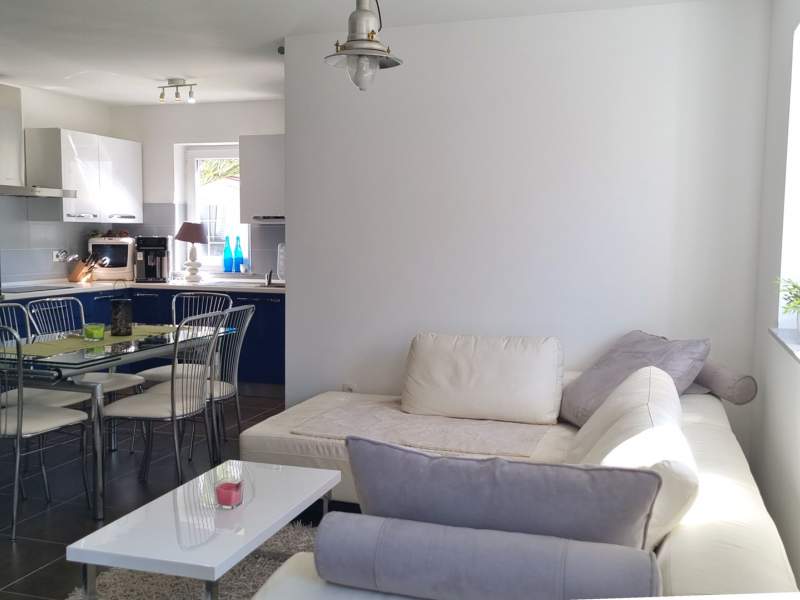 The apartment comes with a fully equipped kitchen with living room and dining area (an additional bed for 2 persons on the couch), 2 bathrooms (shower, toilet, washing machine in one) and a partialli covered terrace with garden (25 m2).