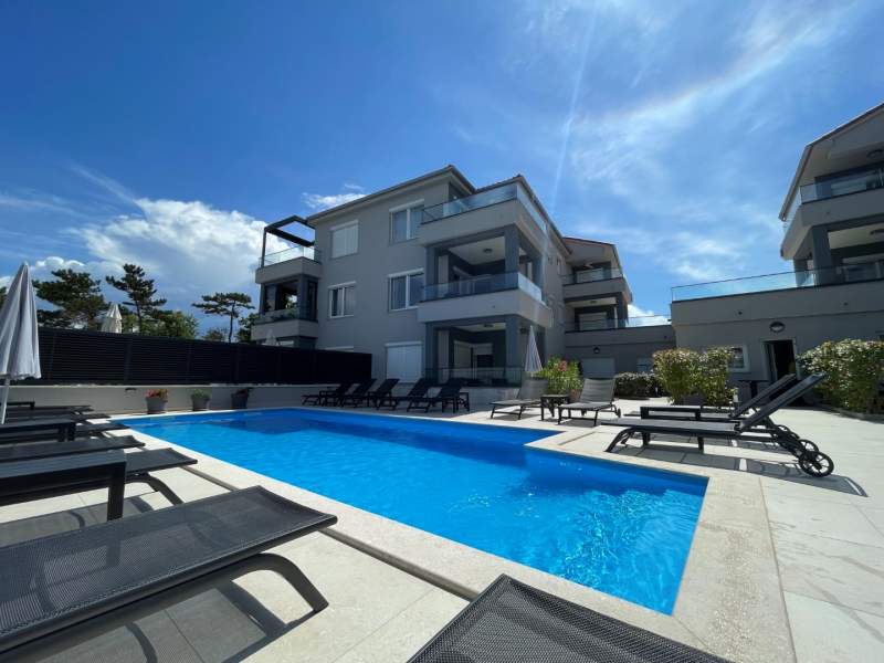 These modern apartments with swimming pool and sea view are located in a building complex in a quiet location just 30 meters from the sea. The building offers a communal saltwater swimming pool (36 m2) open from May to October, with temperatures typically reaching 20-26°C. The pool area is equipped with sun loungers, parasols, and an outdoor shower, and it provides direct access to the sea for comfortable swimming. A shared laundry room on the ground floor includes a washing machine, laundry capsules/detergent, and an iron for guest use. The apartment complex is just a 1 km stroll along the seaside from the town center, a comfortable 15-minute walk. Nearby, you'll find a pebble beach with a beach bar, along with a basketball court and a beach volleyball court. Adjacent to the complex, a diving center offers lessons for beginners and guided dives for experienced divers. This center also houses one of the region's top restaurants, serving a variety of traditional Mediterranean dishes. Free private parking is provided, and each apartment is air-conditioned to ensure a comfortable stay. The complex has a private parking lot with a gate that opens and closes via remote control.