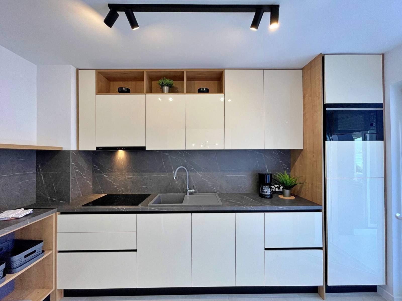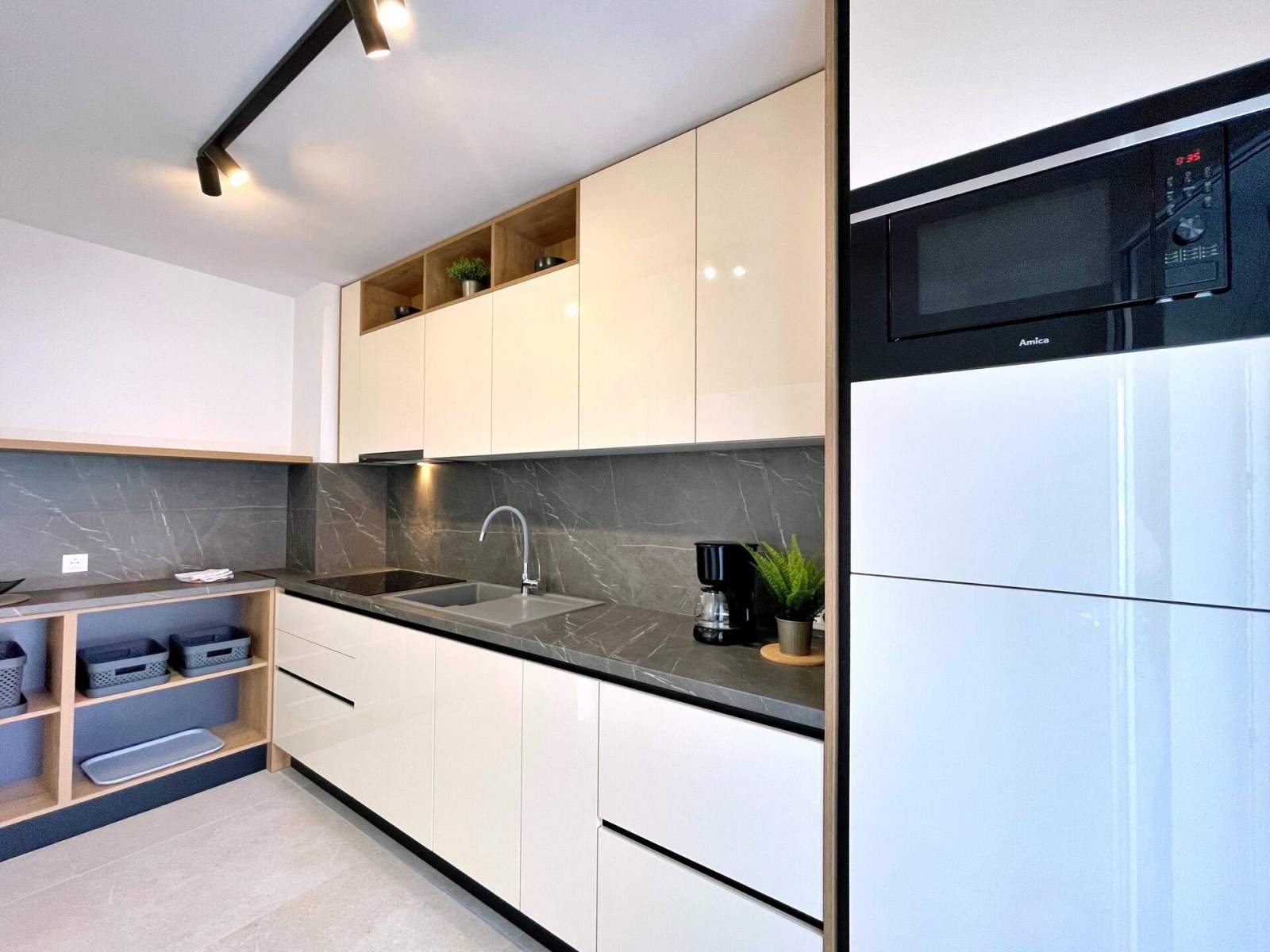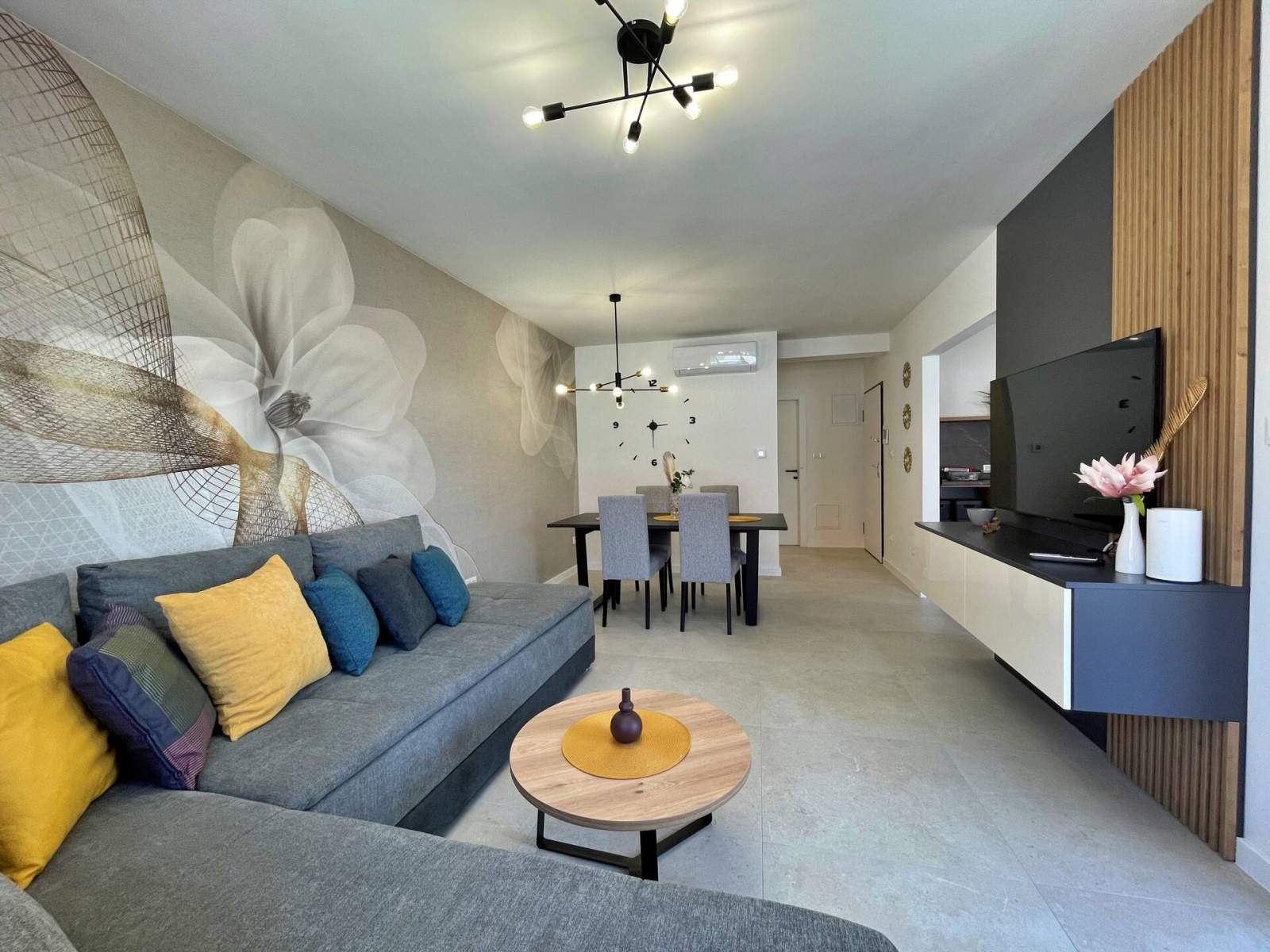 This luxurious, modern seafront apartment is located in a peaceful apartment complex just 30 meters from the sea, surrounded by nature, secluded coves, pebble beaches, and hiking trails. It offers a communal saltwater swimming pool (36 m2) open from May to October, with temperatures typically reaching 20-26°C. The apartment is located on the second floor and features two bedrooms with a queen-size bed in each, a modern kitchen with an induction hob, refrigerator and freezer, kettle, coffee machine, toaster, microwave, and dishwasher. The bathroom has a shower and a toilet. The dining area and living room provide a cozy space with a sofa and Smart TV, while free Wi-Fi is available throughout.