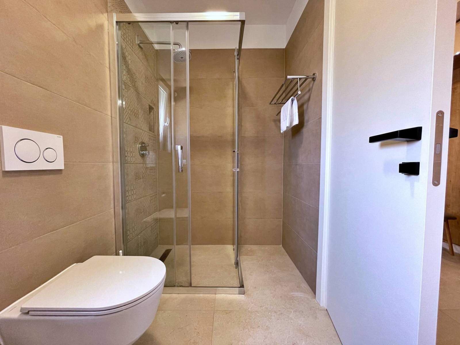 The apartment's furnished roofed balcony (11 m2) offers a beautiful view of both the pool and the sea. The pool area on the ground floor is equipped with sun loungers, parasols, and an outdoor shower, and it provides direct access to the sea for comfortable swimming. A shared laundry room on the ground floor includes a washing machine, laundry capsules/detergent, and an iron for guest use.