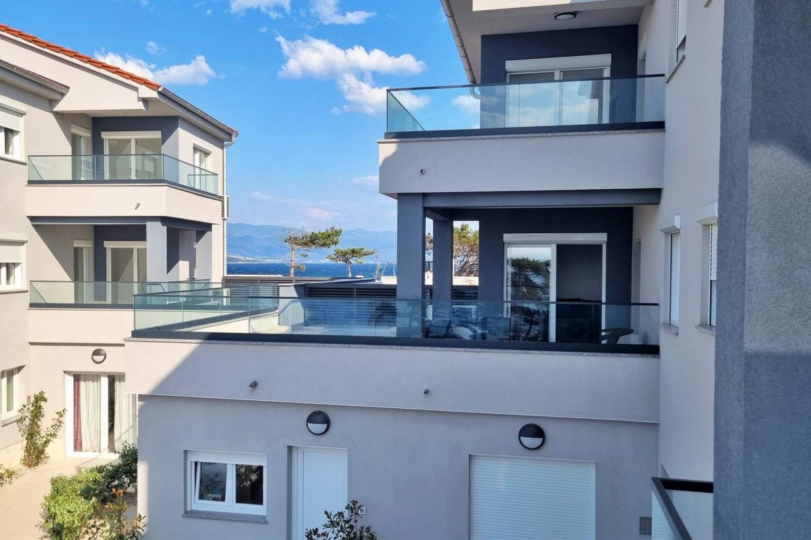 The apartment's furnished roofed terrace (11 m2) offers a beautiful view of both the pool and the sea. The pool area on the ground floor is equipped with sun loungers, parasols, and an outdoor shower, and it provides direct access to the sea for comfortable swimming. A shared laundry room on the ground floor includes a washing machine, laundry capsules/detergent, and an iron for guest use.