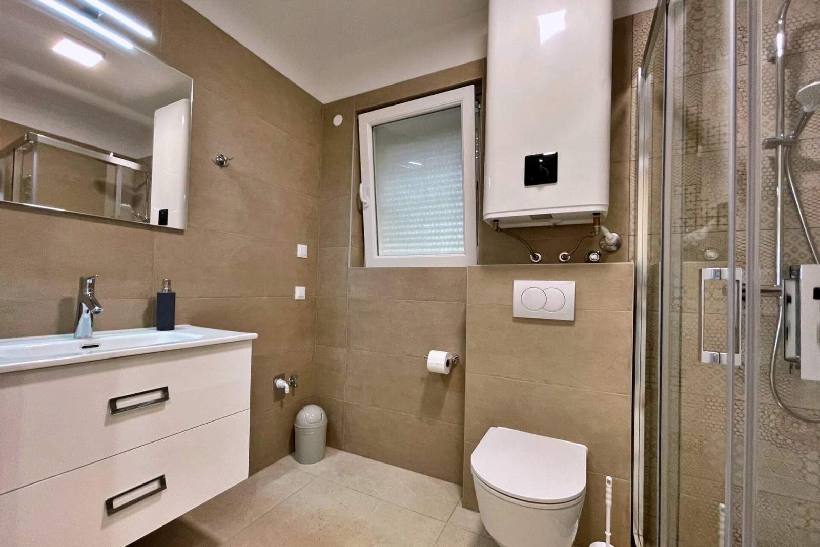 This luxurious, modern seafront apartment is located in a peaceful apartment complex just 30 meters from the sea, surrounded by nature, secluded coves, pebble beaches, and hiking trails. It offers a communal saltwater swimming pool (36 m2) open from May to October, with temperatures typically reaching 20-26°C. The apartment is located on the fist floor and features two bedrooms with a queen-size bed in each, a modern kitchen with an induction hob, refrigerator and freezer, kettle, coffee machine, toaster, microwave, and dishwasher. The bathroom has a shower and a toilet. The dining area and living room provide a cozy space with a sofa and Smart TV, while free Wi-Fi is available throughout.