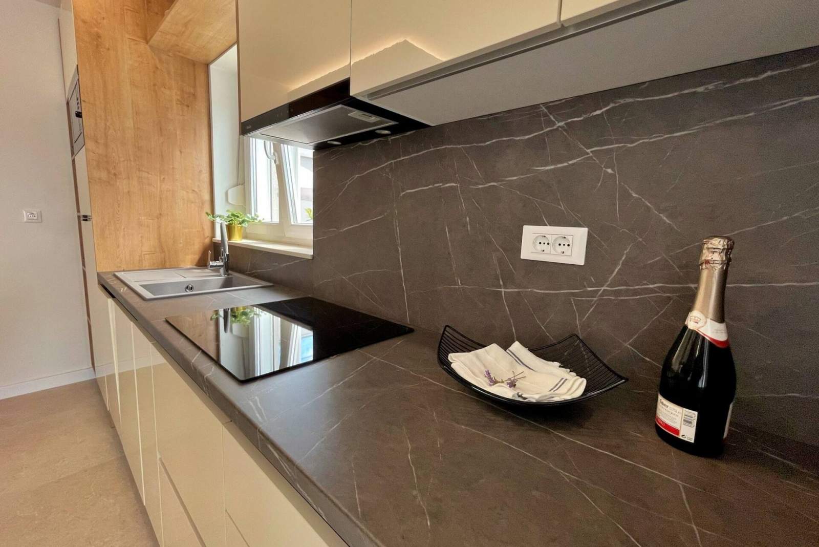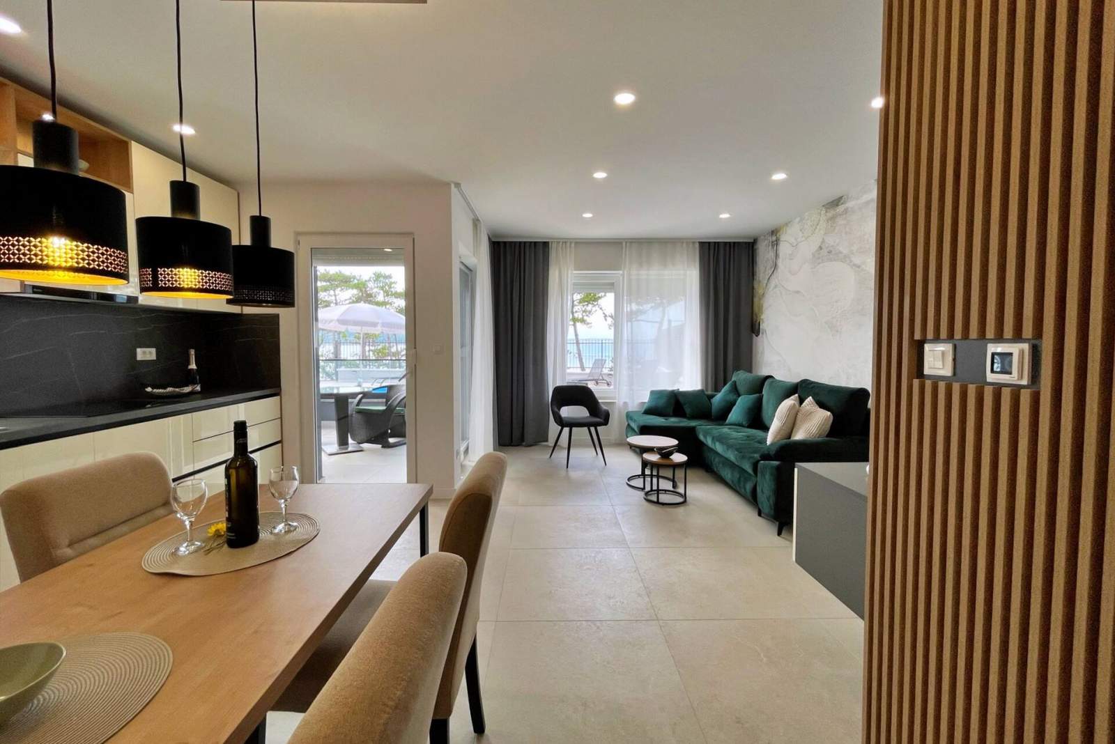 This luxurious, modern seafront apartment is located in a peaceful apartment complex just 30 meters from the sea, surrounded by nature, secluded coves, pebble beaches, and hiking trails. It offers a communal saltwater swimming pool (36 m2) open from May to October, with temperatures typically reaching 20-26°C. The apartment is on the ground floor and features one bedroom with a queen-size bed, a modern kitchen with an induction hob, refrigerator and freezer, kettle, coffee machine, toaster, microwave, and dishwasher. The bathroom has a shower and a toilet. The dining area and living room provide a cozy space with a sofa and Smart TV, while free Wi-Fi is available throughout.