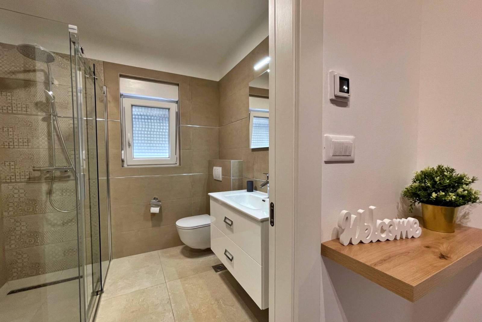 The apartment's roofed terrace (10 m2) offers direct access to the pool area and a beautiful view of both the pool and the sea. The pool area is equipped with sun loungers, parasols, and an outdoor shower, and it provides direct access to the sea for comfortable swimming. A shared laundry room on the ground floor includes a washing machine, laundry capsules/detergent, and an iron for guest use.