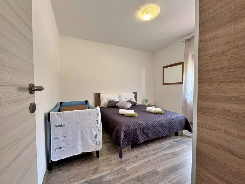 Located just 260 meters from the sea, beach, and town center, this apartment is an ideal choice for families. It features two bedrooms with queen-size beds, a bathroom with a shower and toilet, plus a separate toilet. The well-equipped kitchen includes a 4-burner ceran stove, oven, dishwasher, fridge with freezer, coffee machine, kettle, mixer, juicer, and toaster, along with a spacious dining area. The living room offers a pull-out sofa for two, a Smart TV, air conditioning, and Wi-Fi. Step out onto the 17 m2 balcony, furnished with outdoor furniture and an awning, and enjoy stunning sea and town views. Bed linens, towels, a baby cot, and a highchair are provided for your convenience. A washing machine is available in the ground-floor laundry room, and there's a BBQ area for outdoor cooking. This modern apartment is fully equipped for a memorable family vacation!