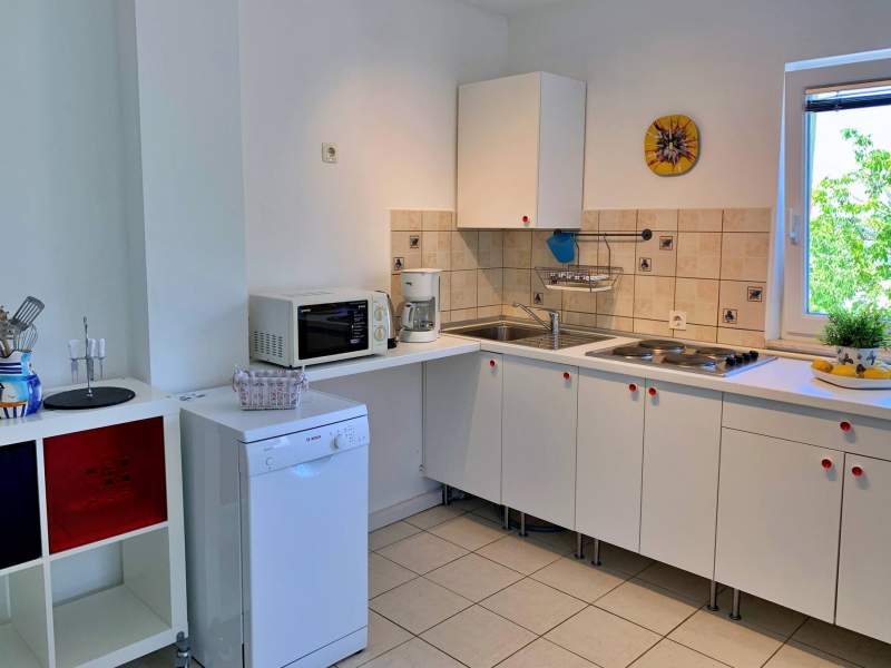 Enjoy a relaxing holiday in this inviting first-floor apartment, perfect for up to 4 guests. It features two cozy bedrooms, each with a queen-size bed, and an open-plan kitchen, living, and dining area. The well-equipped kitchen includes an electric stove, fridge, freezer, dishwasher, coffee machine, kettle, toaster, and microwave—everything you need for a comfortable stay.