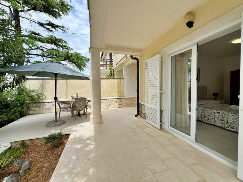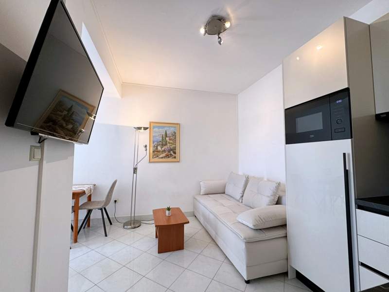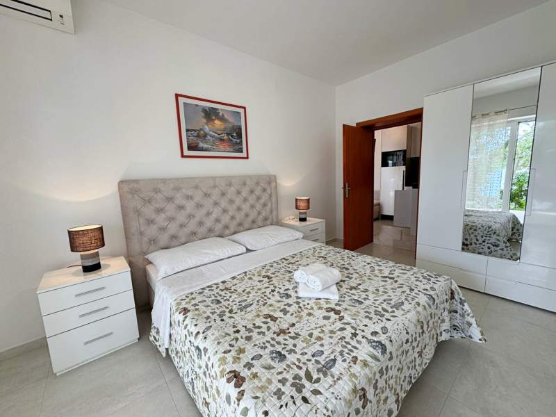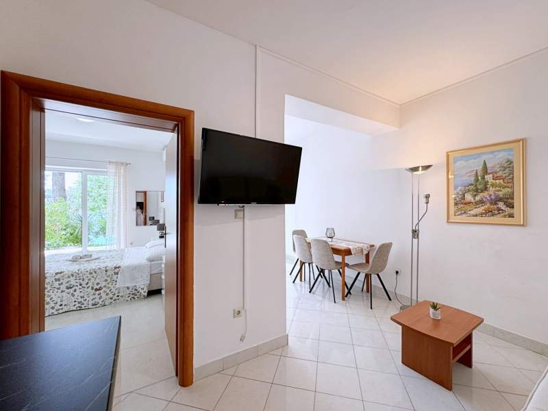 This inviting apartment is just 20 m from the sea and a sandy beach, offering the perfect seaside retreat. It features a bedroom with a queen-size bed and air conditioning, a living room with a pull-out sofa for two, a dining table, and Wi-Fi. The kitchen is equipped with a gas stove, fridge with freezer, coffee machine, and kettle.