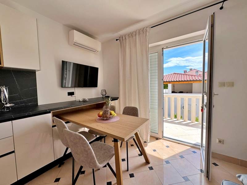 This inviting apartment is just 20 m from the sea and a sandy beach, offering the perfect seaside retreat. It is located on the first floor and features a bedroom with a queen-size bed and a single bed, a living room with a pull-out sofa for one, a dining table, air conditioning and Wi-Fi. The kitchen is equipped with a gas stove, fridge with freezer, coffee machine, and kettle.