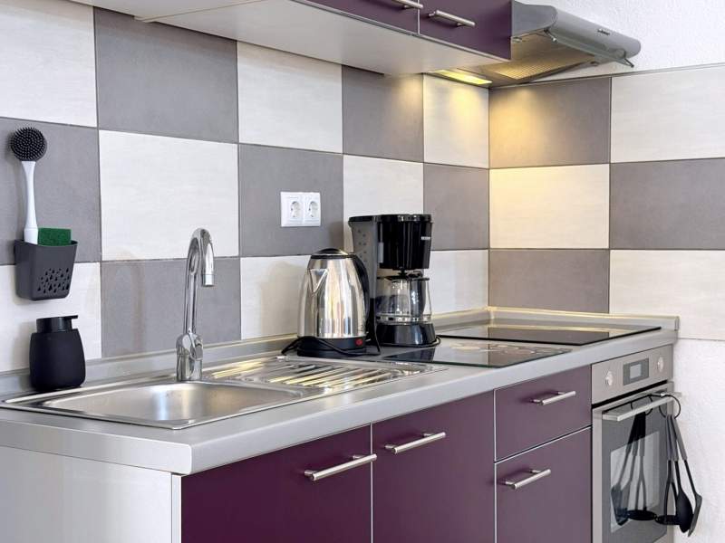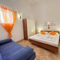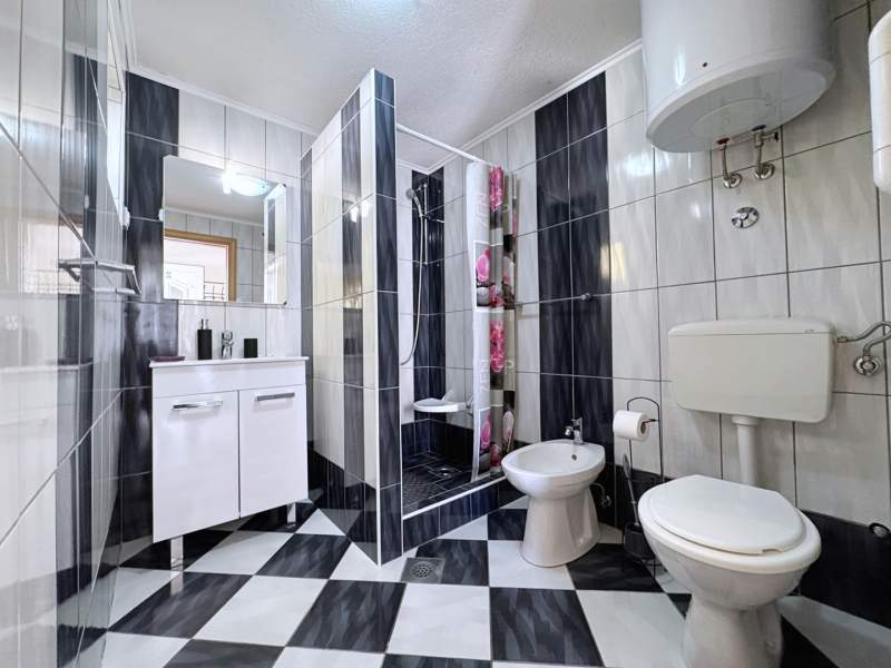 This modern, ground-floor apartment is designed for comfort and convenience, located 1.65 km from the sea. It features a fully equipped kitchen with a ceran stove, oven, fridge with freezer, coffee machine, kettle, and dining table. The living room offers a sofa, satellite TV, Wi-Fi, and air conditioning. There are two bedrooms: one with a queen-size bed and a convertible sofa bed, and the other with a queen-site bed. The bathroom has a shower, toilet, and bidet.
