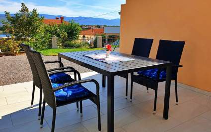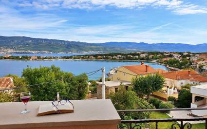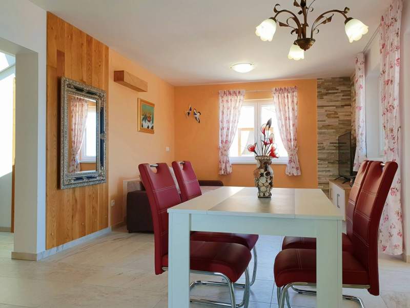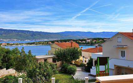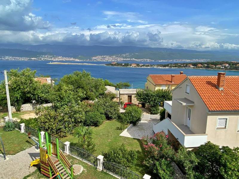 This cozy attic apartment offers two bedrooms with queen beds and a 15 m2 roofed terrace with a dining table and breathtaking panoramic sea views. The kitchen is fully equipped with a ceramic stove, oven, fridge with freezer, dishwasher, coffee machine, kettle, and a dining table. The living room features air conditioning, satellite TV, a sofa, and terrace access. The apartment includes a bathroom with a shower, toilet, and hairdryer. Guests enjoy free Wi-Fi, private parking, a gas BBQ, and access to a shared yard with a children's playground. Located just 160 m from the concrete and pebble beach, the house also offers floor cooling and heating for year-round comfort.