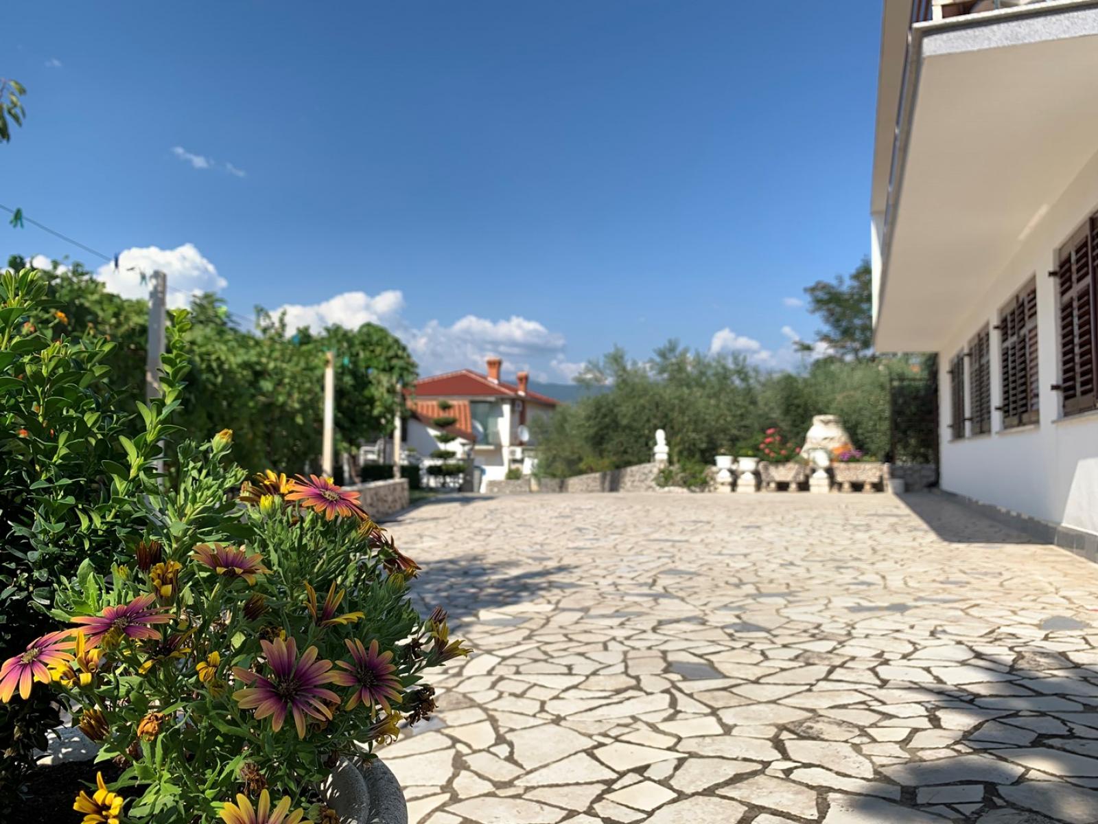 This spacious ground-floor apartment is located just 160 m from the sea. It features a fully equipped kitchen with an electric/gas stove, oven, refrigerator with freezer, coffee machine, water kettle, and toaster. The kitchen is connected to the dining and living room, which includes a seating area and cable/satellite TV. The apartment has four bedrooms—three with queen beds and a washbasin each, and one with a single bed. The two interconnected bathrooms are equipped with two showers, three washbasins, and one toilet. Guests can enjoy a roofed patio (10 m2) in front of the entrance, a shared BBQ area, and private carport parking. Free Wi-Fi is available throughout the apartment.