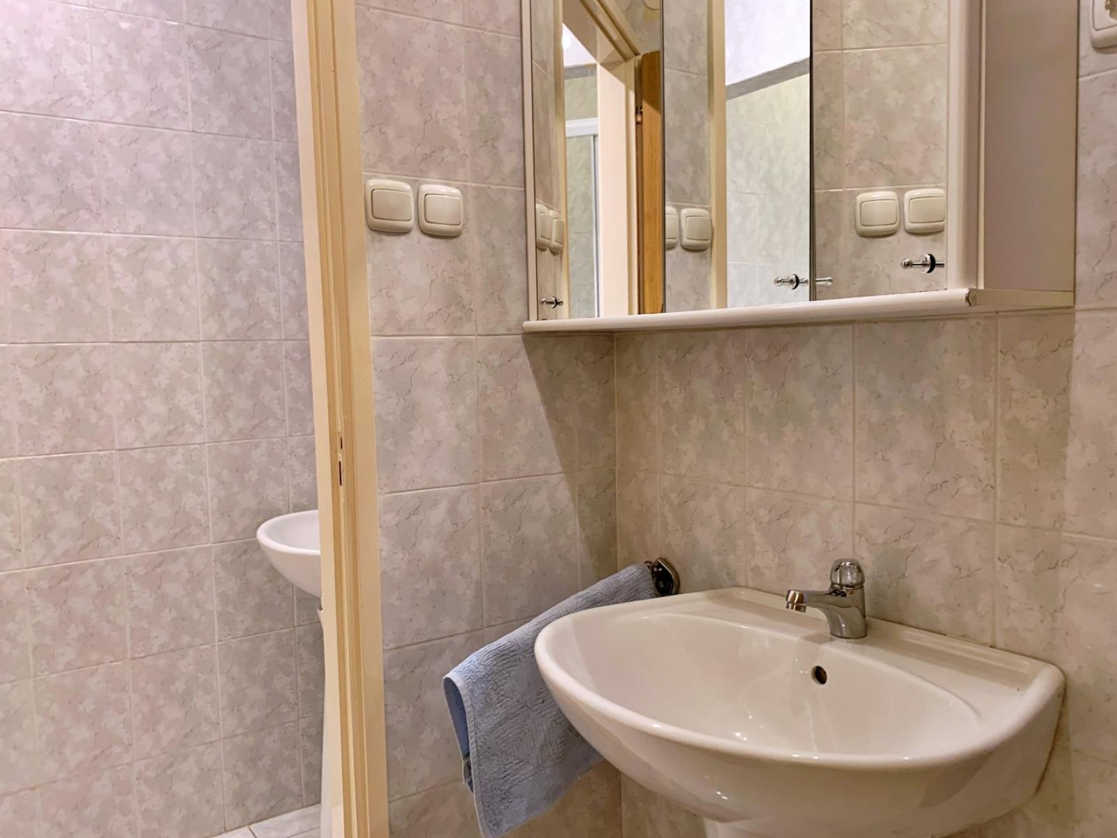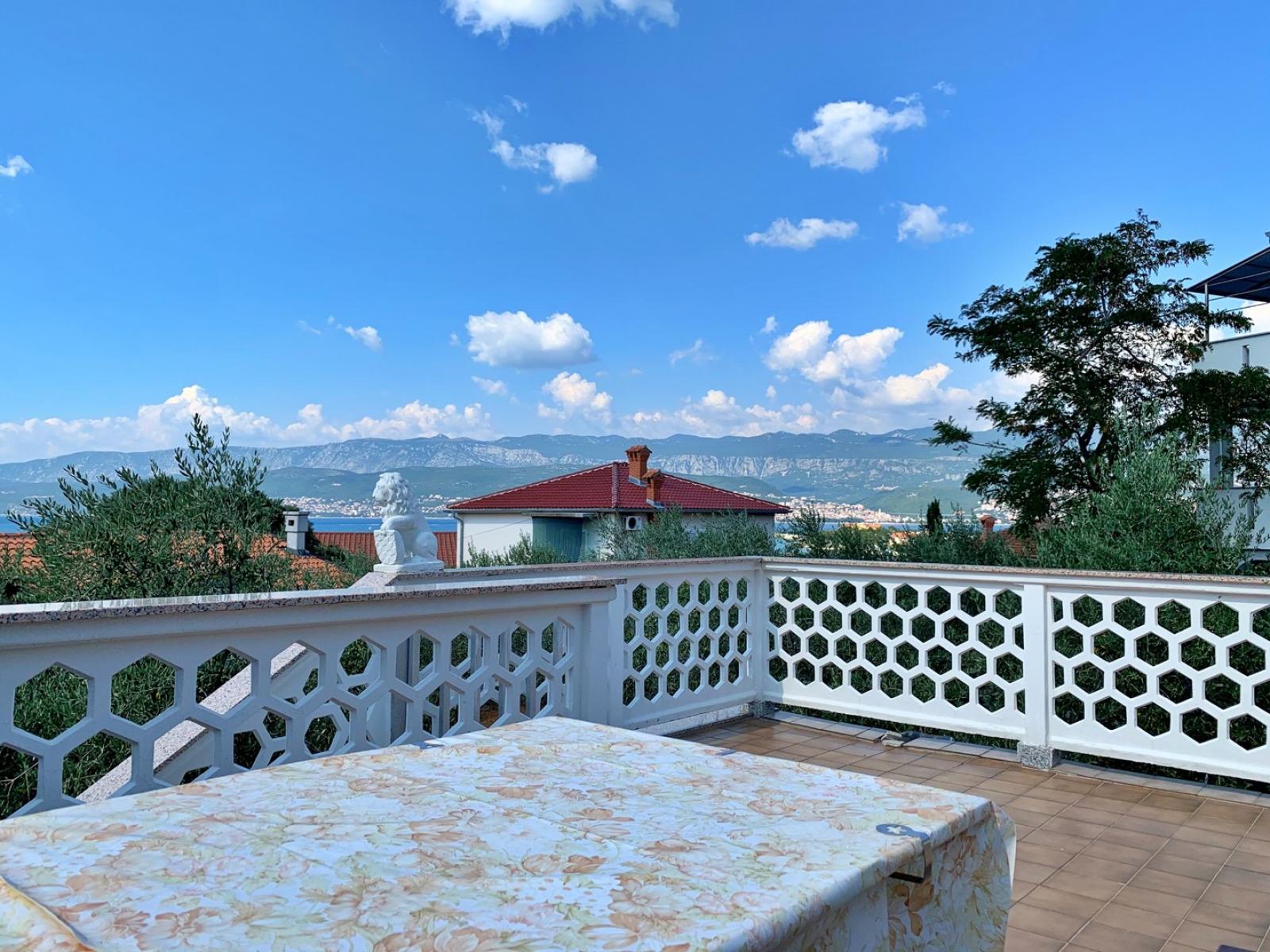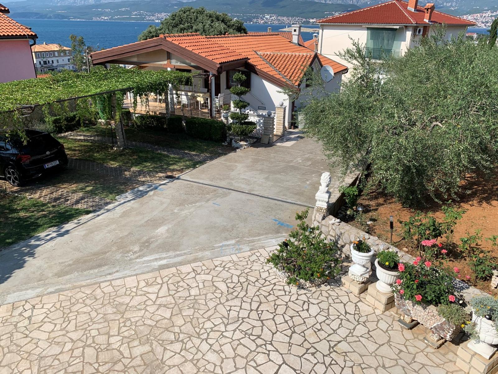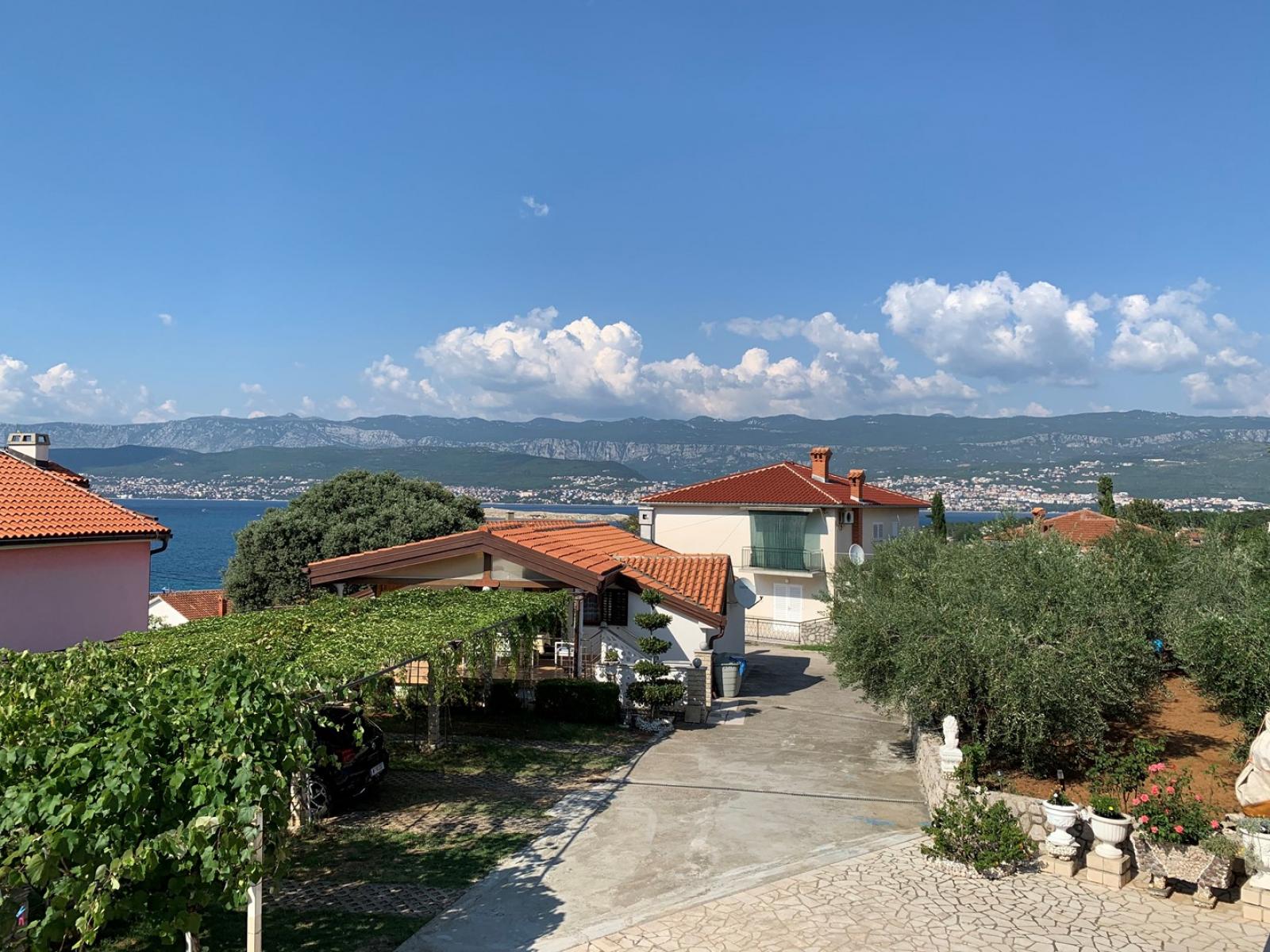 This spacious first-floor apartment is located just 160 m from the sea. It features a fully equipped kitchen with an electric/gas stove, oven, refrigerator with freezer, coffee machine, water kettle, and toaster. The kitchen is connected to the dining and living room, which includes a seating area and cable/satellite TV. Each of the four bedrooms has a queen bed and a washbasin. The two interconnected bathrooms feature two showers, three washbasins, and two toilets. A 10 m2 balcony with a sea view is accessible from each bedroom, while a large 30 m2 terrace also offers stunning sea views. Guests can enjoy a shared BBQ area on the ground floor and private carport parking. Free Wi-Fi is available throughout the apartment.