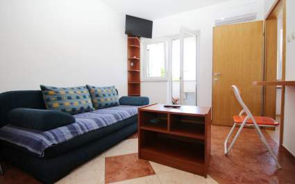 It features a bedroom with a double bed, a bathroom (shower, toilet), living room with an additional bed for 2 persons on the couch, a fully equipped kitchen and a terrace with private BBQ.