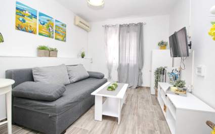 Two-story apartment for 4-6 guests, ideal for families or friends. Located 50 meters from the beach and close to promenade with restaurants and shops. The first floor has a spacious living room with an extra bed on the sofa, a fully equipped kitchen with a dining area, and a bathroom. The second floor has two bedrooms: one with a queen-size bed and an additional bed, and the other with two single beds and a balcony. Air conditioning, free Wi-Fi, and parking 50 meters away. No pets allowed.