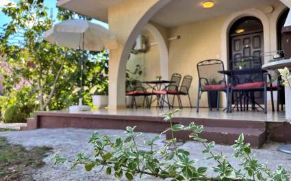 This cozy ground-floor apartment is located 520 m from the sea, offers a queen bedroom with a private balcony, a fully equipped kitchen, and a living room with dining area and twin beds. Guests enjoy a shared roofed terrace with BBQ. Pets are welcome for an additional charge. Wi-Fi and private parking are included.