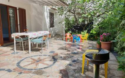 This cozy ground-floor apartment, 250 m from the sea and 290 m from a sandy beach, offers a garden view and a partially roofed 20 m2 terrace with dining space. It features a fully equipped kitchen, a living room with pull-out sofa, TV, Wi-Fi, and air conditioning, plus a bedroom with a queen and single bed, and a bathroom with a bathtub. Garden with BBQ, private parking, bed linens, towels, and an iron are provided.