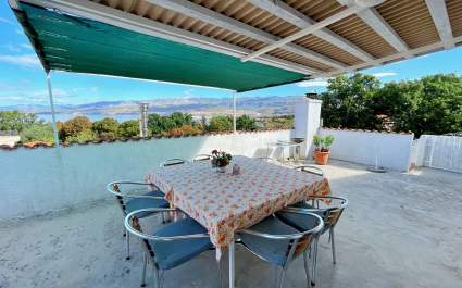 This cozy 2nd-floor apartment in the attic, 250 m from the sea and close to a sandy beach, features a 35 m2 terrace with dining area and portable BBQ. The kitchen is fully equipped, and the living/dining area offers a sofa, TV, Wi-Fi, and air conditioning. Three bedrooms (two with queen beds, one with a queen and single bed) and two bathrooms provide comfort, along with private parking and essentials like bed linens and towels.