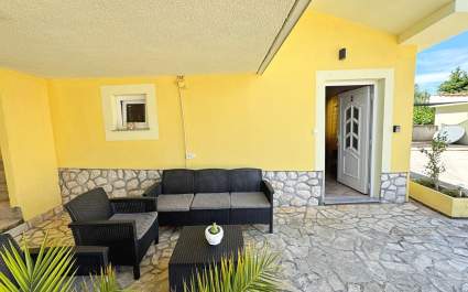 Pets are welcome – one dog stays completely free! Modern ground-floor apartment 1.65 km from the sea with fully equipped kitchen, living room with sofa, SAT TV, Wi-Fi and air conditioning, bedroom with double bed, bathroom, covered terrace, private parking and shared barbecue. Owner lives on-site and is happy to assist.