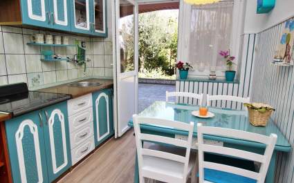 Enjoy a relaxing stay in this inviting first-floor apartment for up to 4 guests. It features two bedrooms with queen-size beds, an open kitchen, living, and dining area. Dine on the 5 m2 roofed balcony or enjoy the shared BBQ and outdoor shower. The spacious bathroom has a shower and toilet. Wi-Fi, air conditioning, and parking are included. The sandy beach is 90 m away, and the town center is 450 m. Baby cot and highchair available upon request.