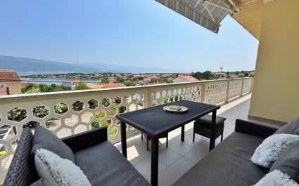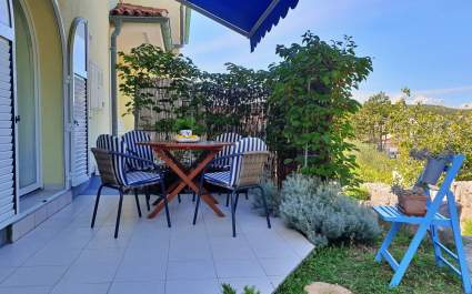Enjoy a summer getaway in this cozy studio for two in the quiet town of Šilo on Krk. The studio offers a double bed, seating area, dining table, satellite TV, air conditioning, and a kitchenette with a 2-burner stove, mini-fridge, coffee machine, kettle, microwave, and toaster. The bathroom has a shower. Relax on the private 4 m2 terrace with a dining table and parasol. Just 80 m from the sandy beach and 450 m from the town center, with free parking, shared BBQ, and outdoor shower.