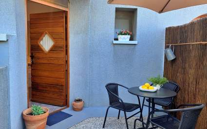 Ground-floor apartment ideal for 2-4 guests. Includes a cozy bedroom with a queen-size bed, wardrobe, and sofa, plus a living/dining room featuring a pull-out sofa, dining table, air conditioning, and satellite TV. The kitchen is has a stove, fridge/freezer, kettle, and coffee machine. The bathroom includes a shower, bidet, toilet, with towels provided. Enjoy a 15 m2 open terrace, shared BBQ, and free parking. Located 370 m from the sea, beach, and restaurants, 220 m from a grocery store.