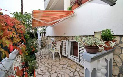 This cozy semi-basement apartment is just 210 meters from the sea and town center, and 250 meters from a sandy beach. It includes a bedroom with a queen bed, a living area with a kitchenette, dining table, and cable TV, plus a private terrace with dining space and an awning. Amenities include a fan in the bedroom, free parking, and a shared BBQ.
