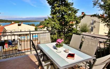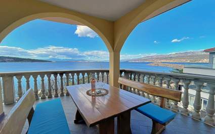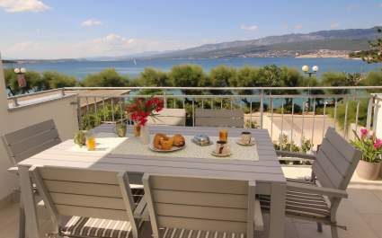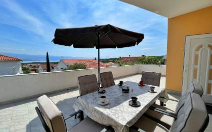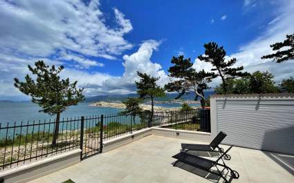 This luxury apartment with sea view is located in a building complex and in a peaceful area. The building has a large saltwater pool (40 m2) for all the guests in the house to use. On the ground floor of the building guests can rest on deckchairs next to the pool. The apartment is located on the ground floor and has a private parking behind the building. There is also a large pebble beach in the immediate vicinity, and a great restaurant, which also offers a selection of local specialties.