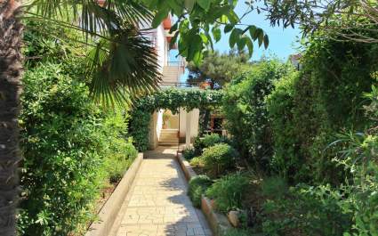 This elevated ground-floor apartment, 800 meters from the sea and town center, has two bedrooms (one queen, two singles) and a 10 m2 roofed terrace with garden views. It includes a fully equipped kitchen, dining area, Wi-Fi, satellite TV, and air conditioning. Guests can enjoy a private garden with sun loungers, free parking, and a shared BBQ. A baby cot is available on request. Pets are welcome for an additional fee.