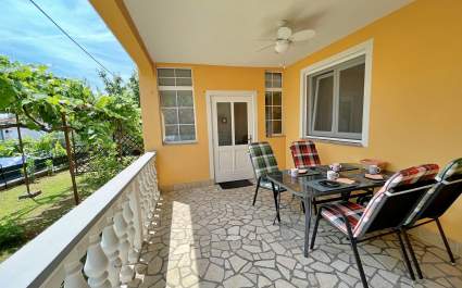 Spacious ground-floor apartment, 200 m from the sea, with two queen-bed bedrooms. The living area has a dining table, satellite TV, air conditioning, a pull-out couch, and access to a 30 m2 roofed terrace with garden views. The kitchen includes an electric stove, oven, fridge, microwave, dishwasher, coffee machine, and kettle. Bathroom with shower, free Wi-Fi, private parking, and a BBQ area ensure a relaxing stay.