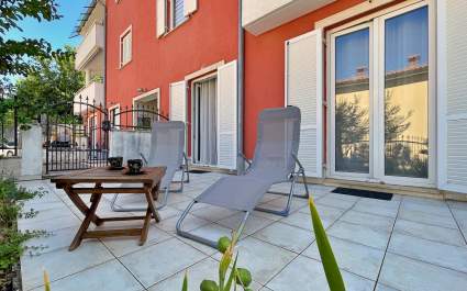 Prostran apartman u prizemlju samo 160 m od mora. Ima kuhinju sa štednjakom, pećnicom, hladnjakom sa zamrzivačem, aparatom za kavu, kuhalom za vodu i tosterom, povezanu s blagovaonicom/dnevnim boravkom. Ima četiri spavaće sobe - tri s bračnim krevetima i umivaonicima, a jedna s jednostrukim krevetom. Dvije povezane kupaonice imaju dva tuša, tri umivaonika i jedan WC. Uživajte u natkrivenoj terasi od 10 m2, zajedničkom roštilju, privatnom parkiralištu i besplatnom Wi-Fiju.