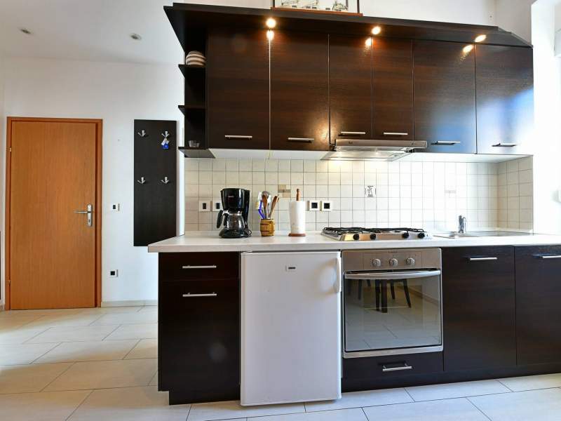 The apartment features a fully equipped kitchen with living room and dining area (an additional bed on the couch) and a bathroom (shower, toilet).